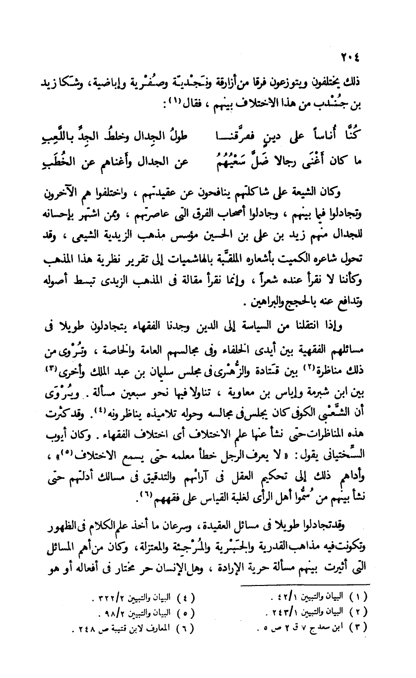 وكان الشيعة على شاكلتهم ينافحون عن عقيدتهم، واختلفوا هم الآخرون وتجادلوا فيما بينهم، وجادلوا أصحاب الفرق التى عاصرتهم، وممن اشتهر بإحسانه للجدال منهم زيد بن على بن الحسين مؤسس مذهب الزيدية الشيعى، وقد تحول شاعره الكميت بأشعاره الملقّبة بالهاشميات إلى تقرير نظرية هذا المذهب وكأننا لا نقرأ عنده شعرا، وإنما نقرأ مقالة فى المذهب الزيدى تبسط أصوله وتدافع عنه بالحجج والبراهين.
