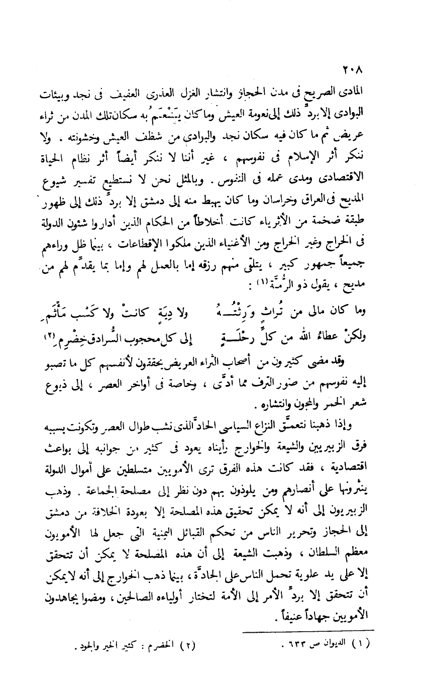 المادى الصريح فى مدن الحجاز وانتشار الغزل العذرى العفيف فى نجد وبيئات البوادى إلا بردّ ذلك إلى نعومة العيش وما كان ينعم به سكان تلك المدن من ثراء عريض ثم ما كان فيه سكان نجد والبوادى من شظف العيش وخشونته، ولا ننكر أثر الإسلام فى نفوسهم، غير أننا لا ننكر أيضا أثر نظام الحياة الاقتصادى ومدى عمله فى النفوس. وبالمثل نحن لا نستطيع تفسير شيوع المديح فى العراق وخراسان وما كان يهبط منه إلى دمشق إلا بردّ ذلك إلى ظهور طبقة ضخمة من الأثرياء كانت أخلاطا من الحكام الذين أداروا شئون الدولة فى الخراج وغير الخراج ومن الأغنياء الذين ملكوا الإقطاعات، بينما ظل وراءهم جميعا جمهور كبير، يتلقى منهم رزقه إما بالعمل لهم وإما بما يقدّم لهم من مديح، يقول ذو الرّمّة (¬1):