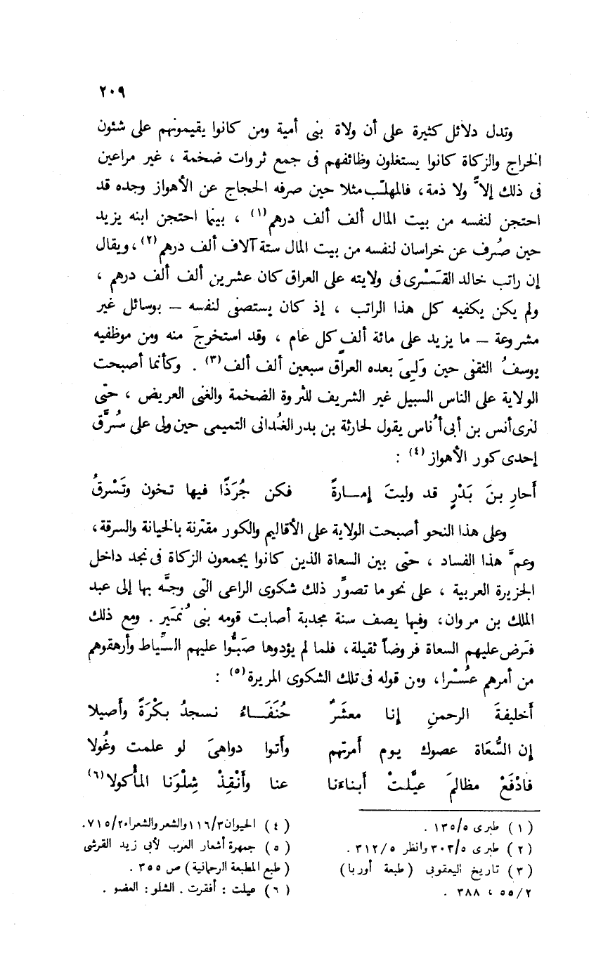 وعلى هذا النحو أصبحت الولاية على الأقاليم والكور مقترنة بالخيانة والسرقة، وعمّ هذا الفساد، حتى بين السعاة الذين كانوا يجمعون الزكاة فى نجد داخل الجزيرة العربية، على نحو ما تصوّر ذلك شكوى الراعى التى وجّه بها إلى عبد الملك بن مروان، وفيها يصف سنة مجدبة أصابت قومه بنى نمير. ومع ذلك فرض عليهم السعاة فروضا ثقيلة، فلما لم يؤدوها صبّوا عليهم السّياط وأرهقوهم من أمرهم عسرا، ومن قوله فى تلك الشكوى المريرة (¬5):