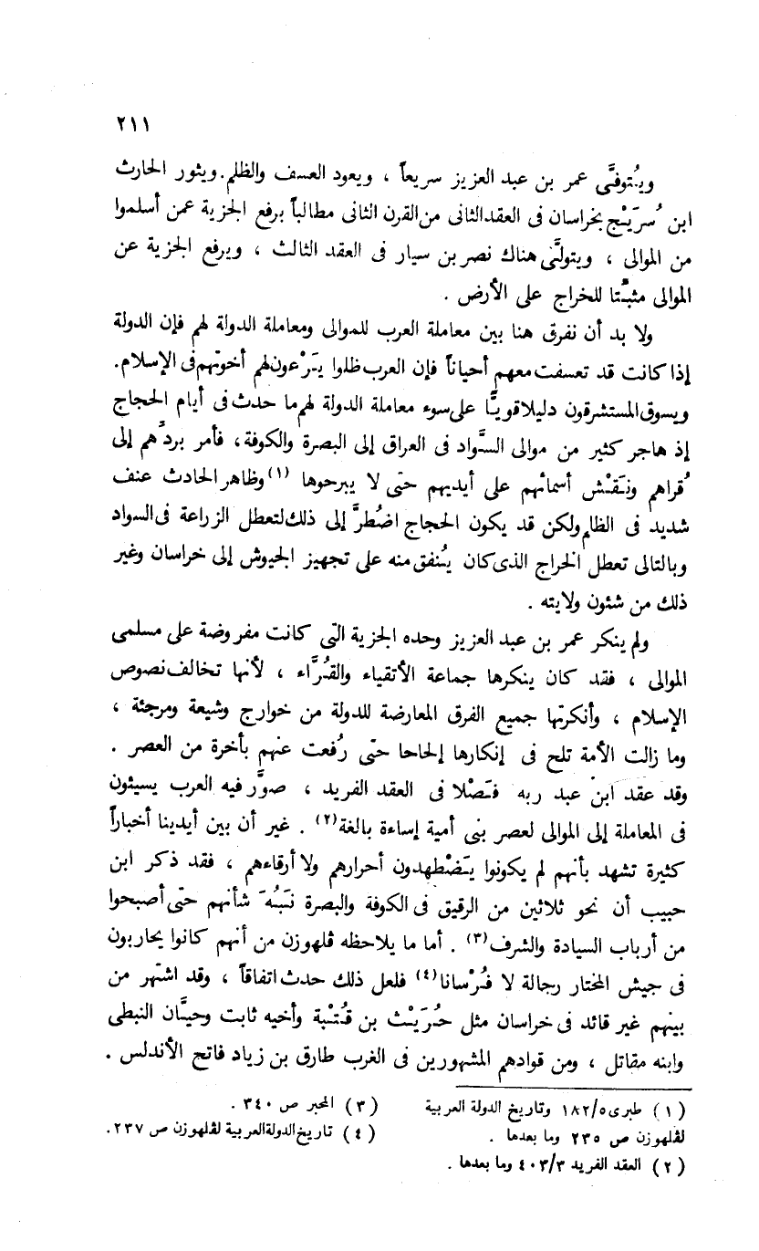وقد عقد ابن عبد ربه فصلا فى العقد الفريد، صوّر فيه العرب يسيئون فى المعاملة إلى الموالى لعصر بنى أمية إساءة بالغة (¬2). غير أن بين أيدينا أخبارا كثيرة تشهد بأنهم لم يكونوا يضطهدون أحرارهم ولا أرقاءهم، فقد ذكر ابن حبيب أن نحو ثلاثين من الرقيق فى الكوفة والبصرة نبه شأنهم حتى أصبحوا من أرباب السيادة والشرف (¬3). أما ما يلاحظه قلهوزن من أنهم كانوا يحاربون فى جيش المختار رجالة لا فرسانا (¬4) فلعل ذلك حدث اتفاقا، وقد اشتهر من بينهم غير قائد فى خراسان مثل حريث بن قتبة وأخيه ثابت وحيّان النبطى وابنه مقاتل، ومن قوادهم المشهورين فى الغرب طارق بن زياد فاتح الأندلس.