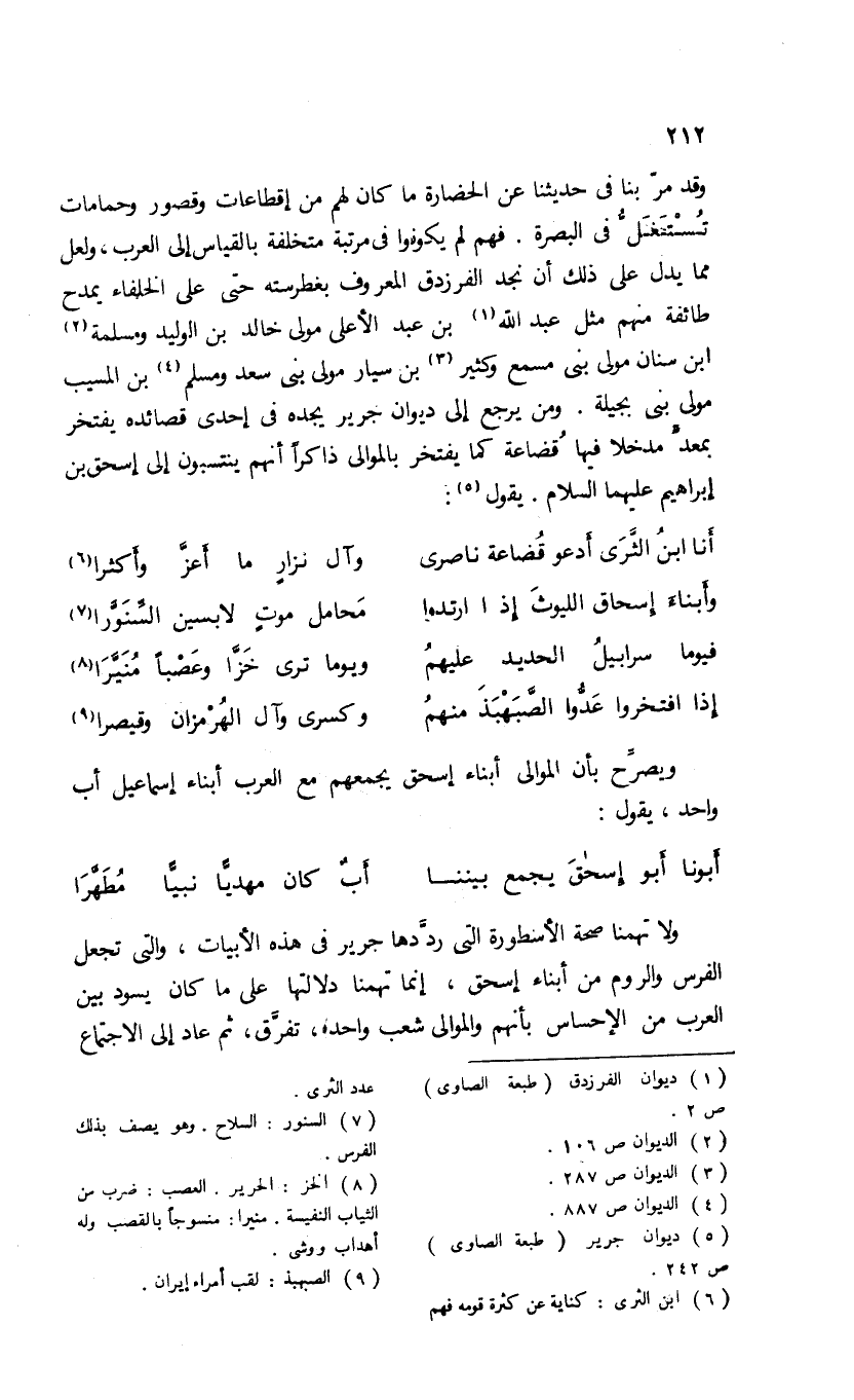 ولا تهمنا صحة الأسطورة التى ردّدها جرير فى هذه الأبيات، والتى تجعل الفرس والروم من أبناء إسحق، إنما تهمنا دلالتها على ما كان يسود بين العرب من الإحساس بأنهم والموالى شعب واحد، تفرّق، ثم عاد إلى الاجتماع