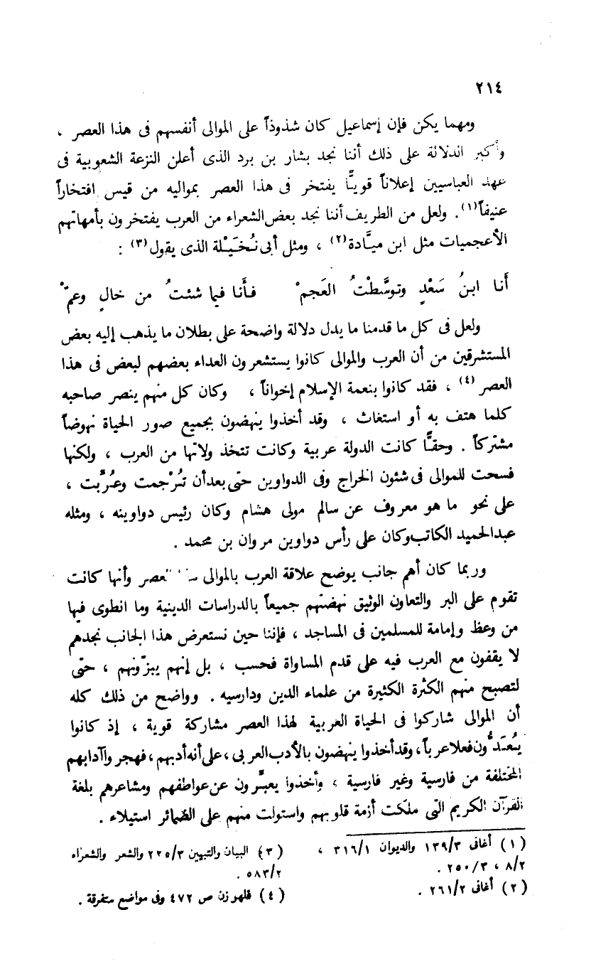 ولعل فى كل ما قدمنا ما يدل دلالة واضحة على بطلان ما يذهب إليه بعض المستشرقين من أن العرب والموالى كانوا يستشعرون العداء بعضهم لبعض فى هذا العصر (¬4)، فقد كانوا بنعمة الإسلام إخوانا، وكان كل منهم ينصر صاحبه كلما هتف به أو استغاث، وقد أخذوا ينهضون بجميع صور الحياة نهوضا مشتركا. وحقّا كانت الدولة عربية وكانت تتخذ ولاتها من العرب، ولكنها فسحت للموالى فى شئون الخراج وفى الدواوين حتى بعد أن ترجمت وعرّبت، على نحو ما هو معروف عن سالم مولى هشام وكان رئيس دواوينه، ومثله عبد الحميد الكاتب وكان على رأس دواوين مروان بن محمد.
