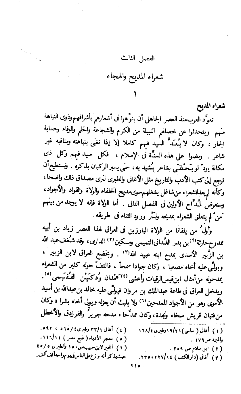 تعوّد العرب منذ العصر الجاهلى أن ينوّهوا فى أشعارهم بأشرافهم وذوى النباهة منهم ويتحدثوا عن خصالهم النبيلة من الكرم والشجاعة والحلم والوفاء وحماية الجار، وكان لا يعدّ السيد فيهم كاملا إلا إذا تغنى بنباهته ومناقبه غير شاعر. ومضوا على هذه السنّة فى الإسلام، فكل سيد فيهم وكل ذى مكانة يودّ لو يحظى بشاعر يشيد به، حتى يسير الركبان بذكره. وتستطيع أن ترجع إلى كتب الأدب والتاريخ مثل الأغانى والطبرى لترى مصداق ذلك واضحا، وكأنه لم يعد للشعراء من شاغل يشغلهم سوى مديح الخلفاء والولاة والقواد والأجواد، وسنعرض لمدّاح الأولين فى الفصل التالى. أما الولاة فإنه لا يوجد من بينهم من لم يتعلق الشعراء بمديحه ونثر ورود الثناء فى طريقه.