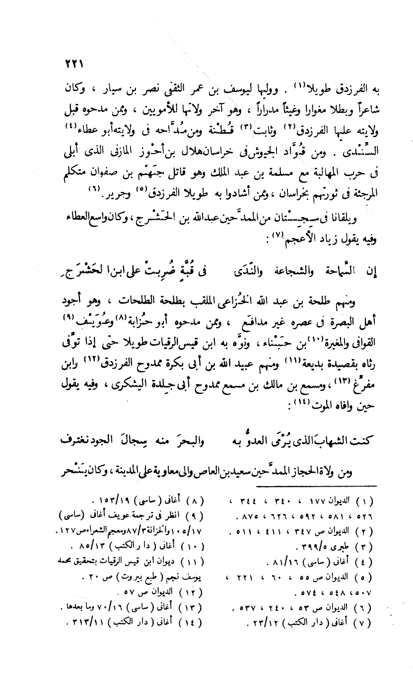 ومنهم طلحة بن عبد الله الخزاعى الملقب بطلحة الطلحات، وهو أجود أهل البصرة فى عصره غير مدافع، وممن مدحوه أبو حزابة (¬8) وعويف (¬9) القوافى والمغيرة (¬10) بن حبناء، ونوّه به ابن قيس الرقيات طويلا حتى إذا توفّى رثاه بقصيدة بديعة (¬11) ومنهم عبيد الله بن أبى بكرة ممدوح الفرزدق (¬12) وابن مفرّغ (¬13)، ومسمع بن مالك بن مسمع ممدوح أبى جلدة اليشكرى، وفيه يقول حين وافاه الموت (¬14):