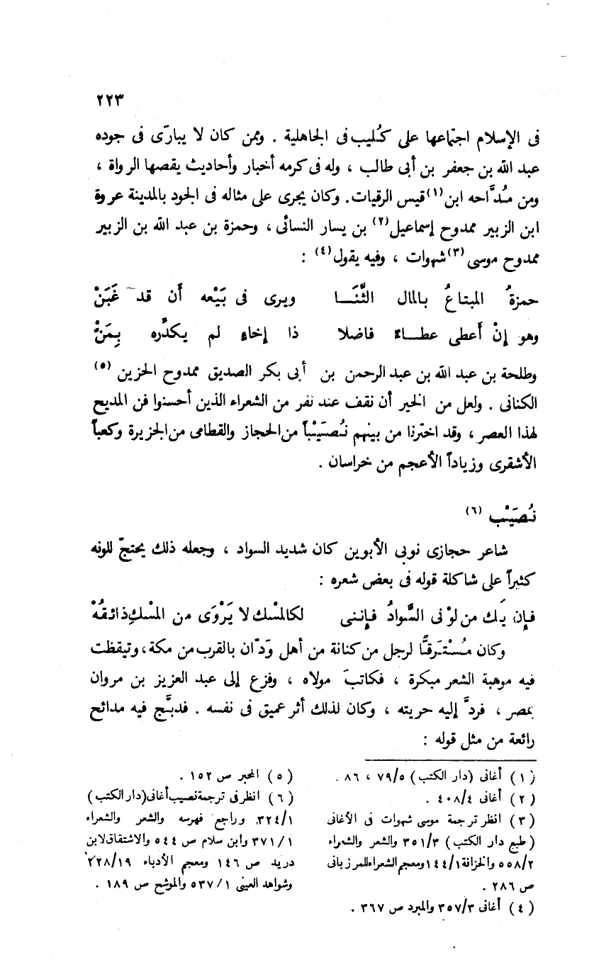 (¬6) انظر فى ترجمة نصيب أغانى (دار الكتب) 1/ 324 وراجع فهرسه والشعر والشعراء 1/ 371 وابن سلام ص 544 والاشتقاق لابن دريد ص 146 ومعجم الأدباء 19/ 228 وشواهد العينى 1/ 537 والموشح ص 189.