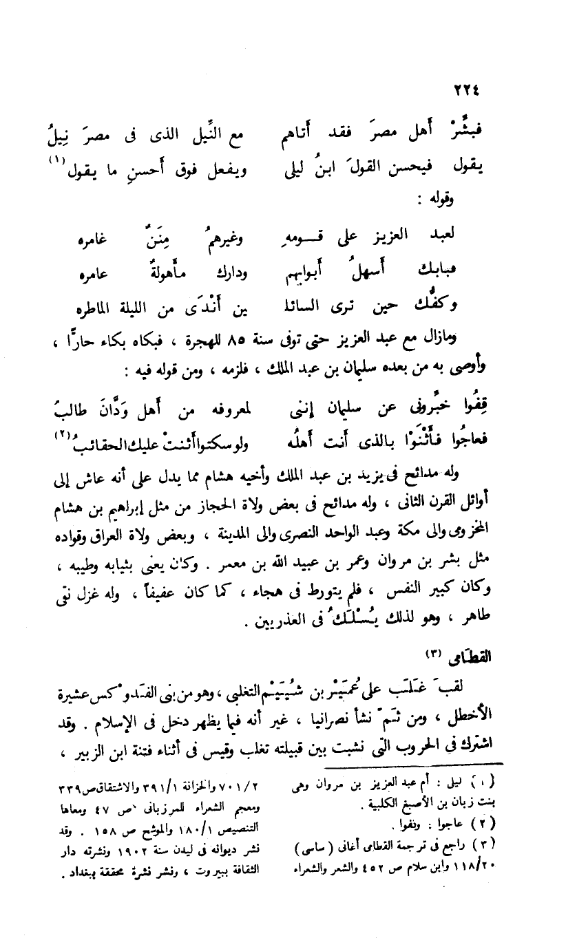 (¬3) راجع فى ترجمة القطامى أغانى (ساسى) 20/ 118 وابن سلام ص 452 والشعر والشعراء 2/ 701 والخزانة 1/ 391 والاشتقاق ص 339 ومعجم الشعراء للمرزبانى ص 47 ومعاهد التنصيص 1/ 180 والموشح ص 158. وقد نشر ديوانه فى ليدن سنة 1902 ونشرته دار الثقافة ببيروت، ونشر نشرة محققة ببغداد.