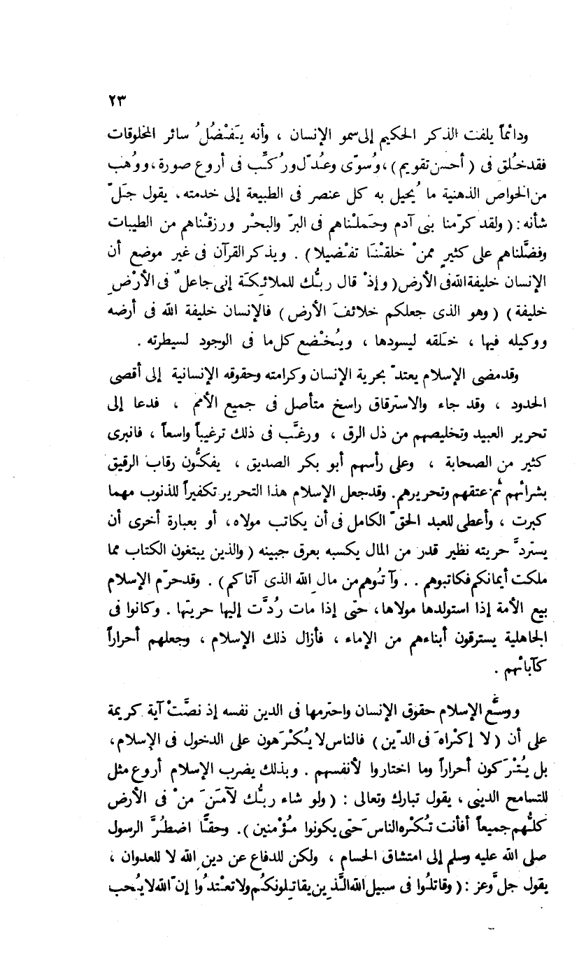 ووسّع الإسلام حقوق الإنسان واحترمها فى الدين نفسه إذ نصّت آية كريمة على أن {(لا إِكْراهَ فِي الدِّينِ)} فالناس لا يكرهون على الدخول فى الإسلام، بل يتركون أحرارا وما اختاروا لأنفسهم. وبذلك يضرب الإسلام أروع مثل للتسامح الدينى، يقول تبارك وتعالى: {(وَلَوْ شاءَ رَبُّكَ لَآمَنَ مَنْ فِي الْأَرْضِ كُلُّهُمْ جَمِيعاً أَفَأَنْتَ تُكْرِهُ النّاسَ حَتّى يَكُونُوا مُؤْمِنِينَ).} وحقّا اضطرّ الرسول صلى الله عليه وسلم إلى امتشاق الحسام، ولكن للدفاع عن دين الله لا للعدوان، يقول جلّ وعز: {(وَقاتِلُوا فِي سَبِيلِ اللهِ الَّذِينَ يُقاتِلُونَكُمْ وَلا تَعْتَدُوا إِنَّ اللهَ لا يُحِبُّ}