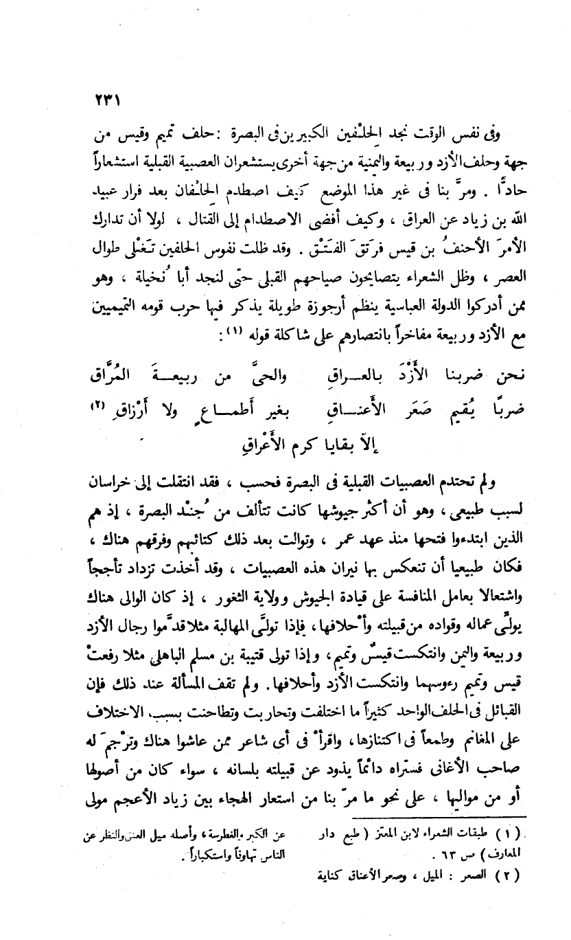 وفى نفس الوقت نجد الحلفين الكبيرين فى البصرة: حلف تميم وقيس من جهة وحلف الأزد وربيعة واليمنية من جهة أخرى يستشعران العصبية القبلية استشعارا حادّا. ومرّ بنا فى غير هذا الموضع كيف اصطدم الحلفان بعد فرار عبيد الله بن زياد عن العراق، وكيف أفضى الاصطدام إلى القتال، لولا أن تدارك الأمر الأحنف بن قيس فرتق الفتق. وقد ظلت نفوس الحلفين تغلى طوال العصر، وظل الشعراء يتصايحون صياحهم القبلى حتى لنجد أبا نخيلة، وهو ممن أدركوا الدولة العباسية ينظم أرجوزة طويلة يذكر فيها حرب قومه التميميين مع الأزد وربيعة مفاخرا بانتصارهم على شاكلة قوله (¬1):