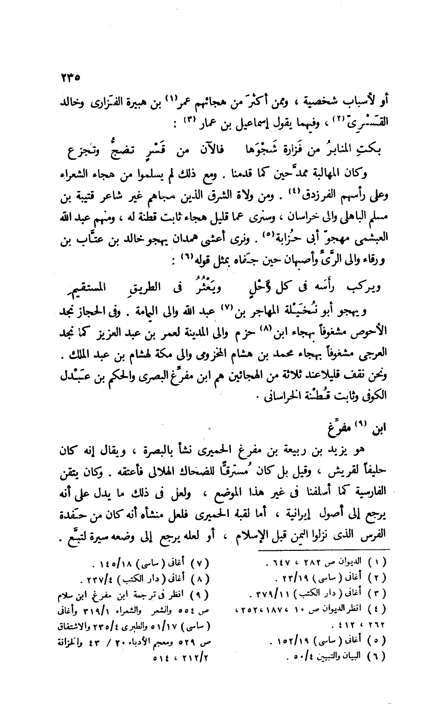 (¬9) انظر فى ترجمة ابن مفرغ ابن سلام ص 554 والشعر والشعراء 1/ 319 وأغانى (ساسى) 17/ 51 والطبرى 4/ 235 والاشتقاق ص 529 ومعجم الأدباء 20/ 43 والخزانة 2/ 212، 514