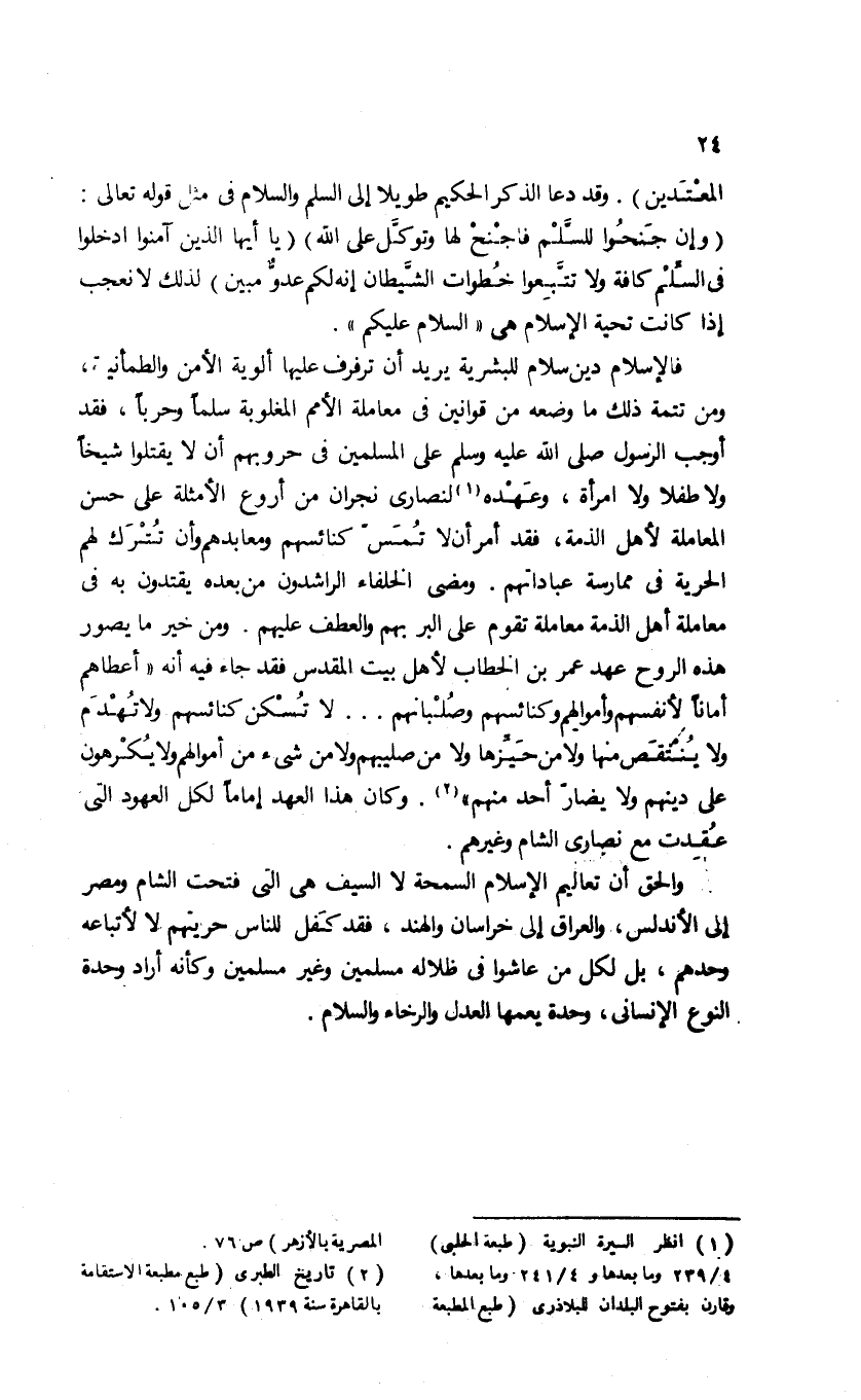 فالإسلام دين سلام للبشرية يريد أن ترفرف عليها ألوية الأمن والطمأنينة، ومن تتمة ذلك ما وضعه من قوانين فى معاملة الأمم المغلوبة سلما وحربا، فقد أوجب الرسول صلى الله عليه وسلم على المسلمين فى حروبهم أن لا يقتلوا شيخا ولا طفلا ولا امرأة، وعهده (¬1) لنصارى نجران من أروع الأمثلة على حسن المعاملة لأهل الذمة، فقد أمر أن لا تمسّ كنائسهم ومعابدهم وأن تترك لهم الحرية فى ممارسة عباداتهم. ومضى الخلفاء الراشدون من بعده يقتدون به فى معاملة أهل الذمة معاملة تقوم على البر بهم والعطف عليهم. ومن خير ما يصور هذه الروح عهد عمر بن الخطاب لأهل بيت المقدس فقد جاء فيه أنه «أعطاهم أمانا لأنفسهم وأموالهم وكنائسهم وصلبانهم. . . لا تسكن كنائسهم ولا تهدم ولا ينتقص منها ولا من حيّزها ولا من صليبهم ولا من شئ من أموالهم ولا يكرهون على دينهم ولا يضارّ أحد منهم» (¬2). وكان هذا العهد إماما لكل العهود التى عقدت مع نصارى الشام وغيرهم.