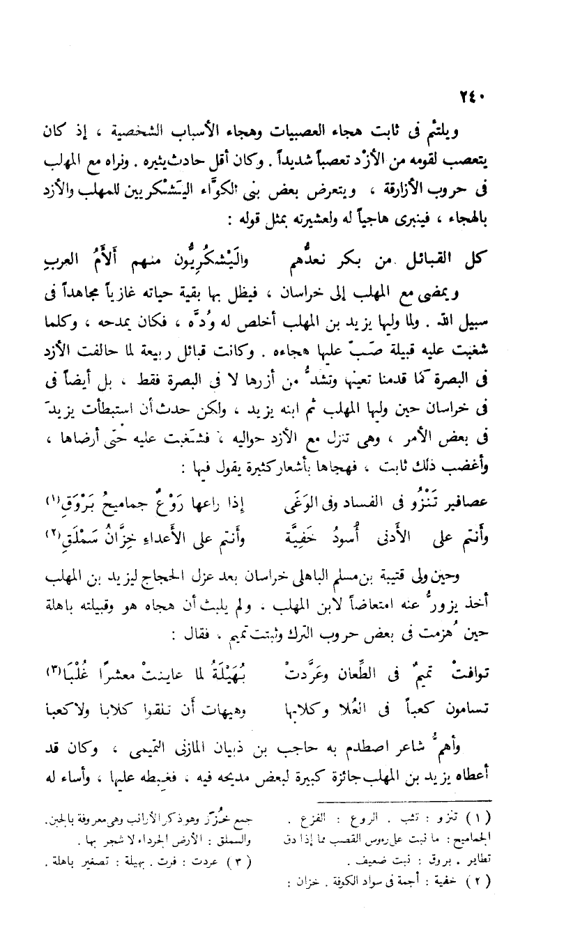 ويلتئم فى ثابت هجاء العصبيات وهجاء الأسباب الشخصية، إذ كان يتعصب لقومه من الأزد تعصبا شديدا. وكان أقل حادث يثيره. ونراه مع المهلب فى حروب الأزارقة، ويتعرض بعض بنى الكوّاء اليشكريين للمهلب والأزد بالهجاء، فينبرى هاجيا له ولعشيرته بمثل قوله: