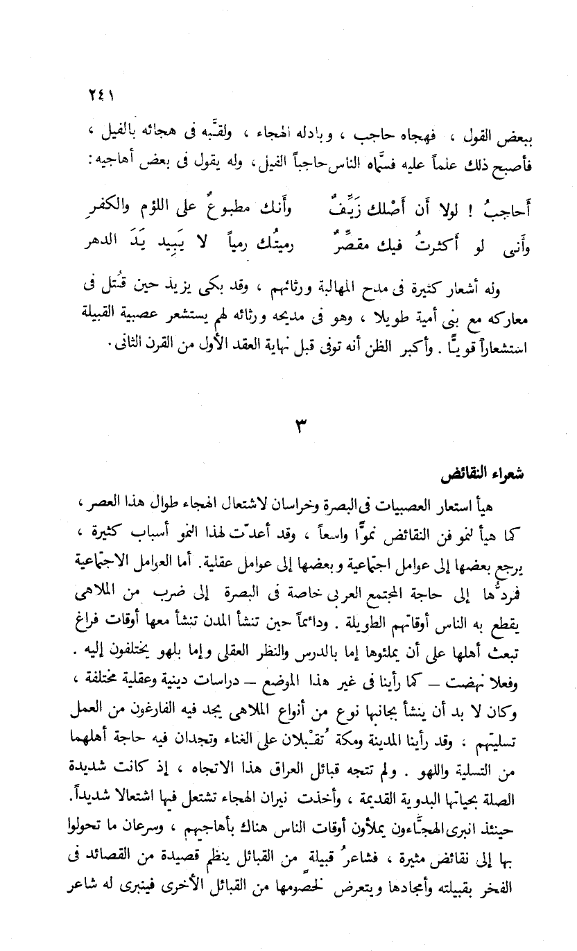 وفعلا نهضت-كما رأينا فى غير هذا الموضع-دراسات دينية وعقلية مختلفة، وكان لا بد أن ينشأ بجانبها نوع من أنواع الملاهى يجد فيه الفارغون من العمل تسليتهم، وقد رأينا المدينة ومكة تقبلان على الغناء وتجدان فيه حاجة أهلهما من التسلية واللهو. ولم تتجه قبائل العراق هذا الاتجاه، إذ كانت شديدة الصلة بحياتها البدوية القديمة، وأخذت نيران الهجاء تشتعل فيها اشتعالا شديدا.
