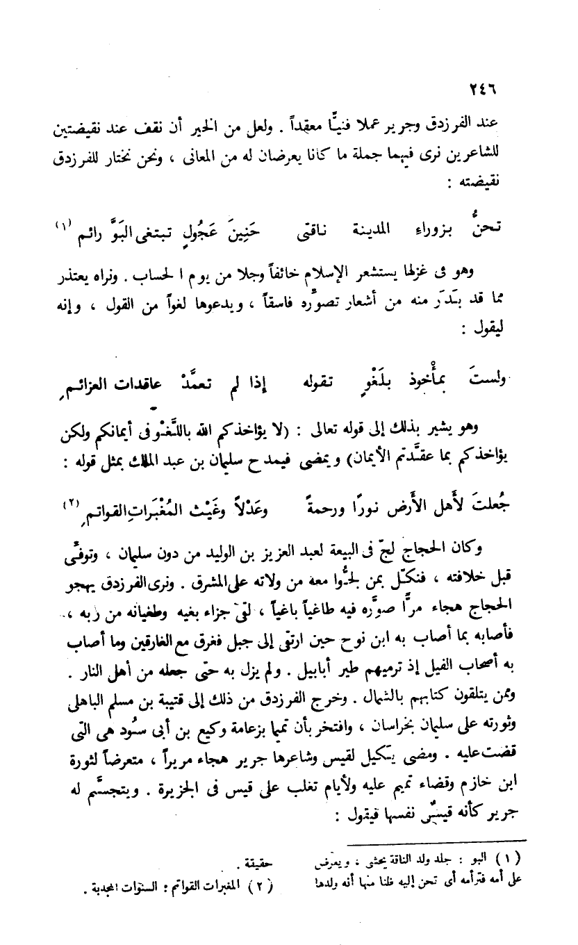 عند الفرزدق وجرير عملا فنيّا معقدا. ولعل من الخير أن نقف عند نقيضتين للشاعرين نرى فيهما جملة ما كانا يعرضان له من المعانى، ونحن نختار للفرزدق نقيضته: