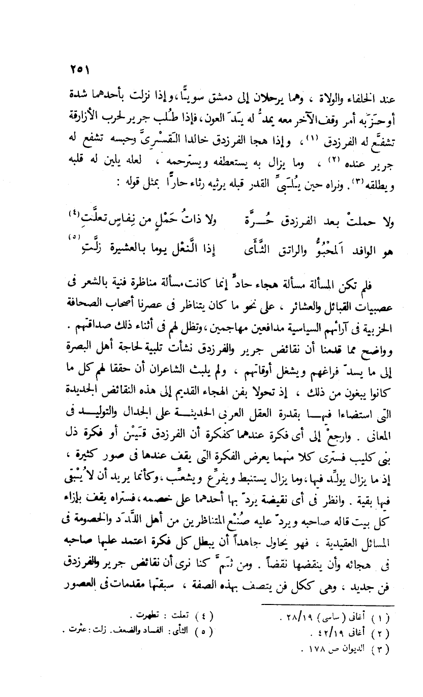 فلم تكن المسألة مسألة هجاء حادّ إنما كانت مسألة مناظرة فنية بالشعر فى عصبيات القبائل والعشائر، على نحو ما كان يتناظر فى عصرنا أصحاب الصحافة الحزبية فى آرائهم السياسية مدافعين مهاجمين، وتظل لهم فى أثناء ذلك صداقتهم.