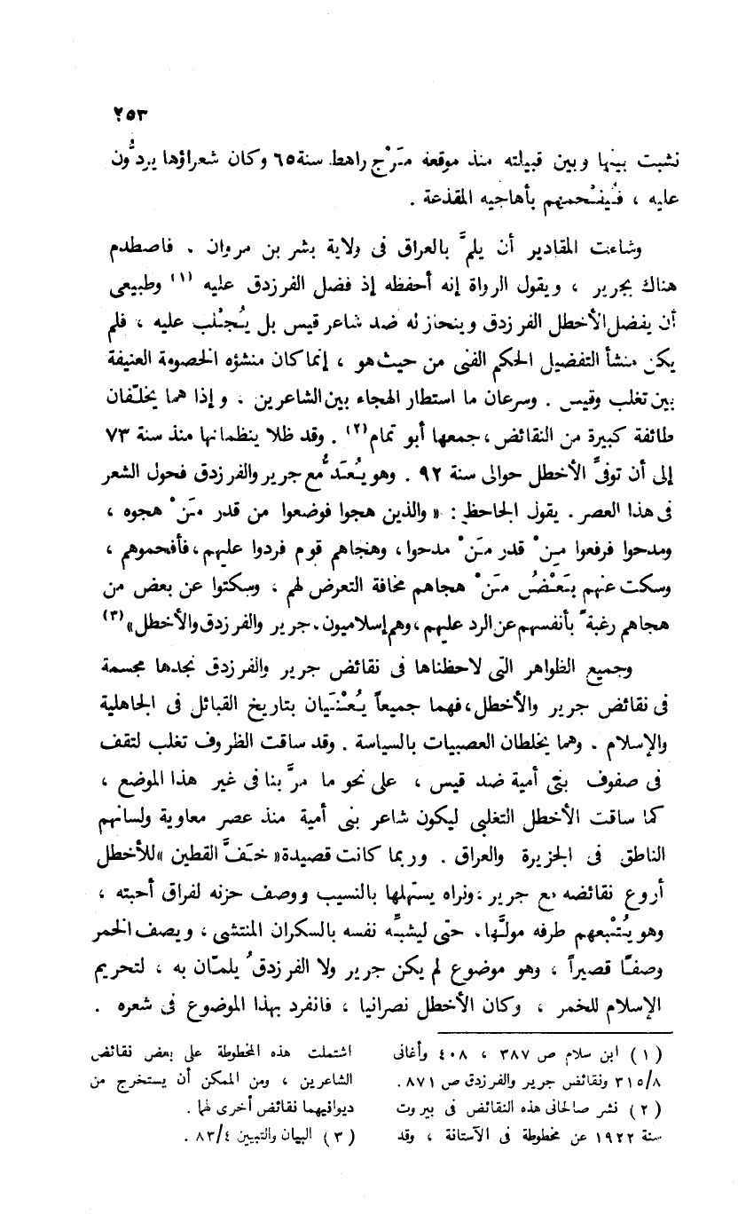 (¬2) نشر صالحانى هذه النقائض فى بيروت سنة 1022 عن مخطوطة فى الآستانة، وقد اشتملت هذه المخطوطة على بعض نقائض الشاعرين، ومن الممكن أن يستخرج من ديوانيهما نقائض أخرى لهما.