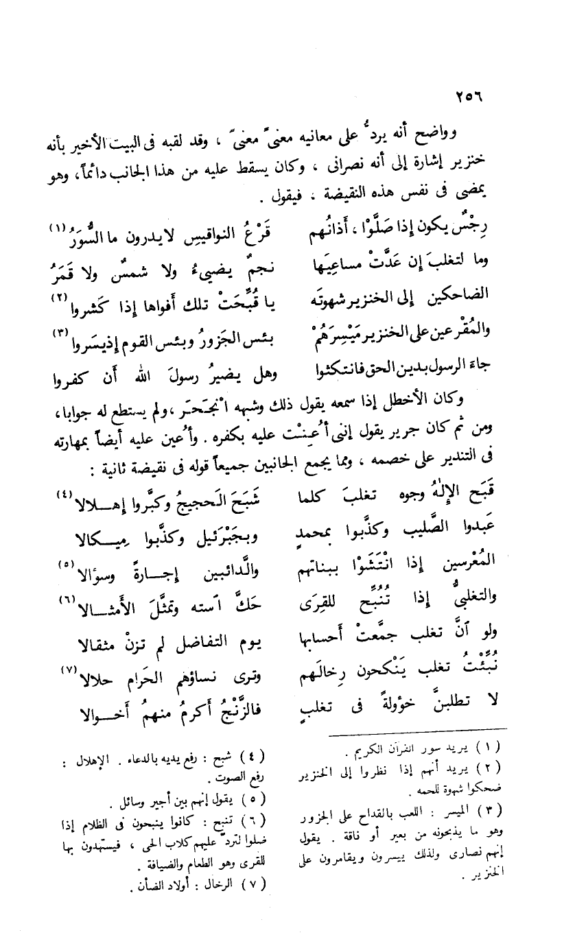 وواضح أنه يردّ على معانيه معنى معنى، وقد لقبه فى البيت الأخير بأنه خنزير إشارة إلى أنه نصرانى، وكان يسقط عليه من هذا الجانب دائما، وهو يمضى فى نفس هذه النقيضة، فيقول.