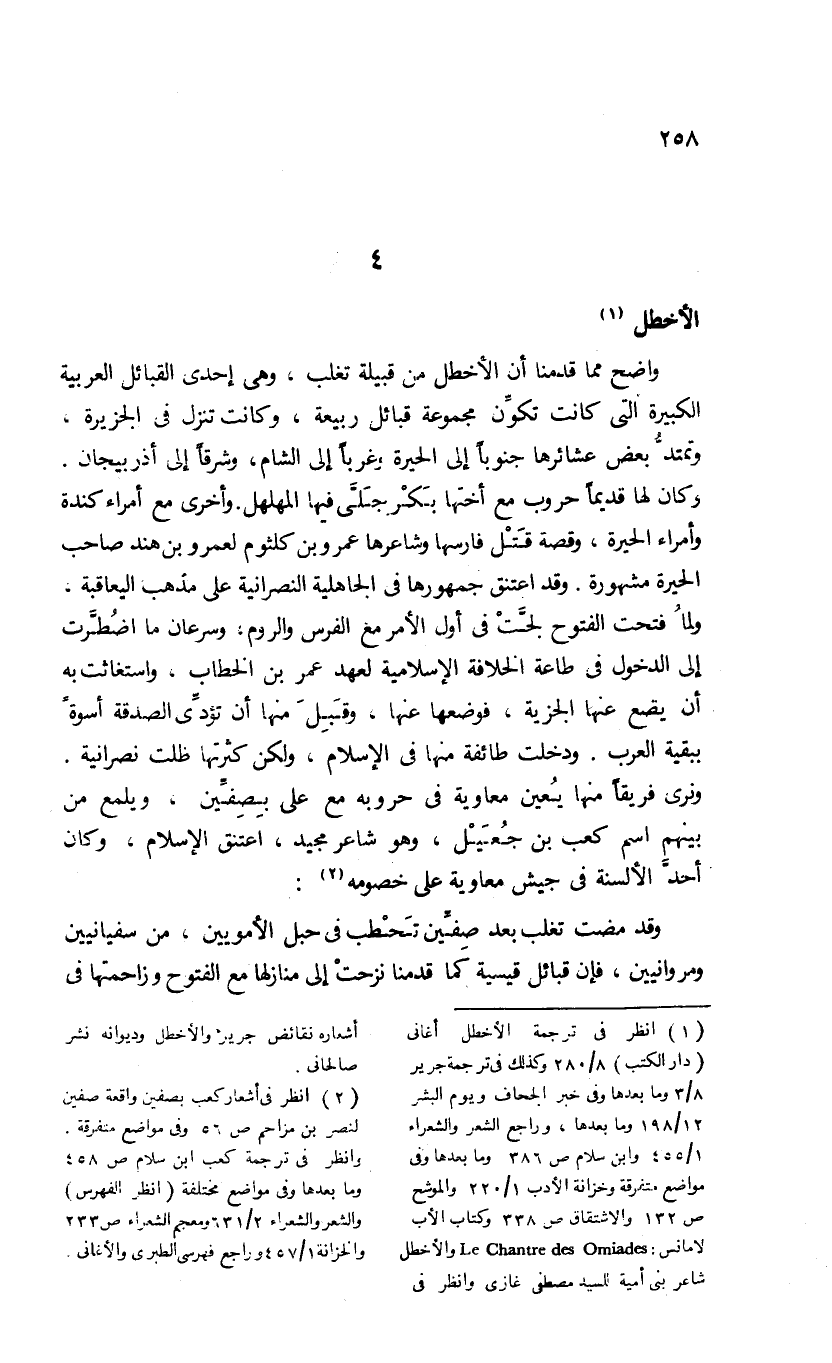 (¬1) انظر فى ترجمة الأخطل أغانى (دار الكتب) 8/ 280 وكذلك فى ترجمة جرير 8/ 3 وما بعدها وفى خبر الجحاف ويوم البشر 12/ 198 وما بعدها، وراجع الشعر والشعراء 1/ 455 وابن سلام ص 386 وما بعدها وفى مواضع متفرقة وخزانة الأدب 1/ 220 والموشح ص 132 والاشتقاق ص 338 وكتاب الأب لامانس Le Chantre des Omiades: والأخطل شاعر بنى أمية للسيد مصطفى غازى وانظر فى أشعاره نقائض جرير والأخطل وديوانه نشر صالحانى.