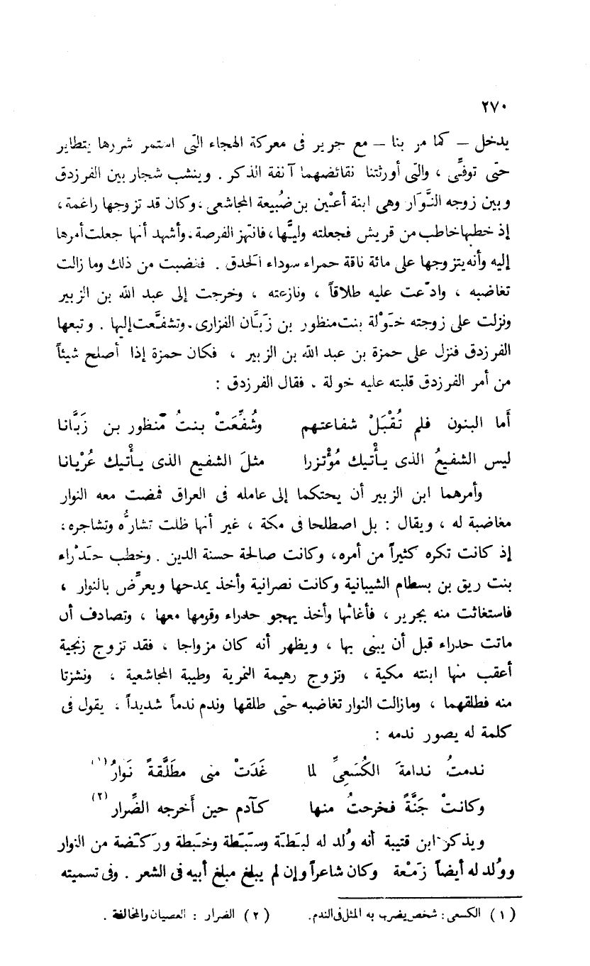 يدخل-كما مر بنا-مع جرير فى معركة الهجاء التى استمر شررها يتطاير حتى توفّى، والتى أورثتنا نقائضهما آنفة الذكر. وينشب شجار بين الفرزدق وبين زوجه النّوار وهى ابنة أعين بن ضبيعة المجاشعى، وكان قد تزوجها راغمة، إذ خطبها خاطب من قريش فجعلته وليّها، فانتهز الفرصة، وأشهد أنها جعلت أمرها إليه وأنه يتزوجها على مائة ناقة حمراء سوداء الحدق. فغضبت من ذلك وما زالت تغاضبه، وادّعت عليه طلاقا، ونازعته، وخرجت إلى عبد الله بن الزبير ونزلت على زوجته خولة بنت منظور بن زبّان الفزارى، وتشفّعت إليها. وتبعها الفرزدق فنزل على حمزة بن عبد الله بن الزبير، فكان حمزة إذا أصلح شيئا من أمر الفرزدق قلبته عليه خولة، فقال الفرزدق: