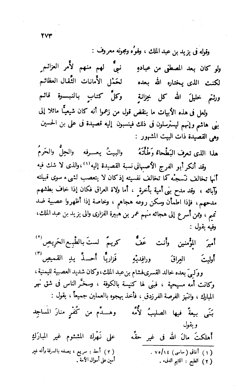 ولعل فى هذه الأبيات ما ينقض قول من زعموا أنه كان شيعيّا مائلا إلى بنى هاشم وإنهم ليسترسلون فى ذلك فينسبون إليه قصيدة فى على بن الحسين وهى القصيدة ذات البيت المشهور: