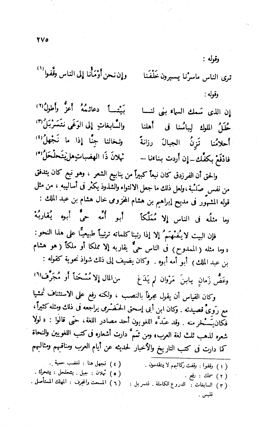 «وما مثله (الممدوح) فى الناس حىّ يقاربه إلا مملكا أو ملكا (هو هشام بن عبد الملك) أبو أمه أبوه. وكان يضيف إلى ذلك شواذ نحوية كقوله: