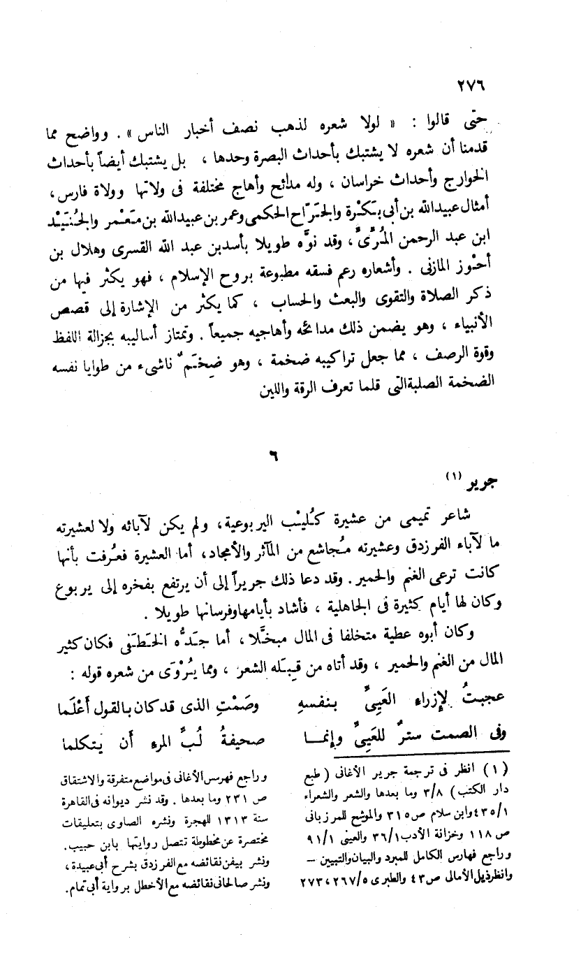 (¬1) انظر فى ترجمة جرير الأغانى (طبع دار الكتب) 8/ 3 وما بعدها والشعر والشعراء 1/ 435 وابن سلام ص 315 والموشح للمرزبانى ص 118 وخزانة الأدب 1/ 36 والعينى 1/ 91 وراجع فهارس الكامل للمبرد والبيان والتبيين- وانظر ذيل الأمالى ص 43 والطبرى 5/ 267، 273 وراجع فهرس الأغانى فى مواضع متفرقة والاشتقاق ص 231 وما بعدها. وقد نشر ديوانه فى القاهرة سنة 1313 للهجرة ونشره الصاوى بتعليقات مختصرة عن مخطوطة تتصل روايتها بابن حبيب. ونشر بيفن نقائضه مع الفرزدق بشرح أبى عبيدة، ونشر صالحانى نقائضه مع الأخطل برواية أبى تمام.
