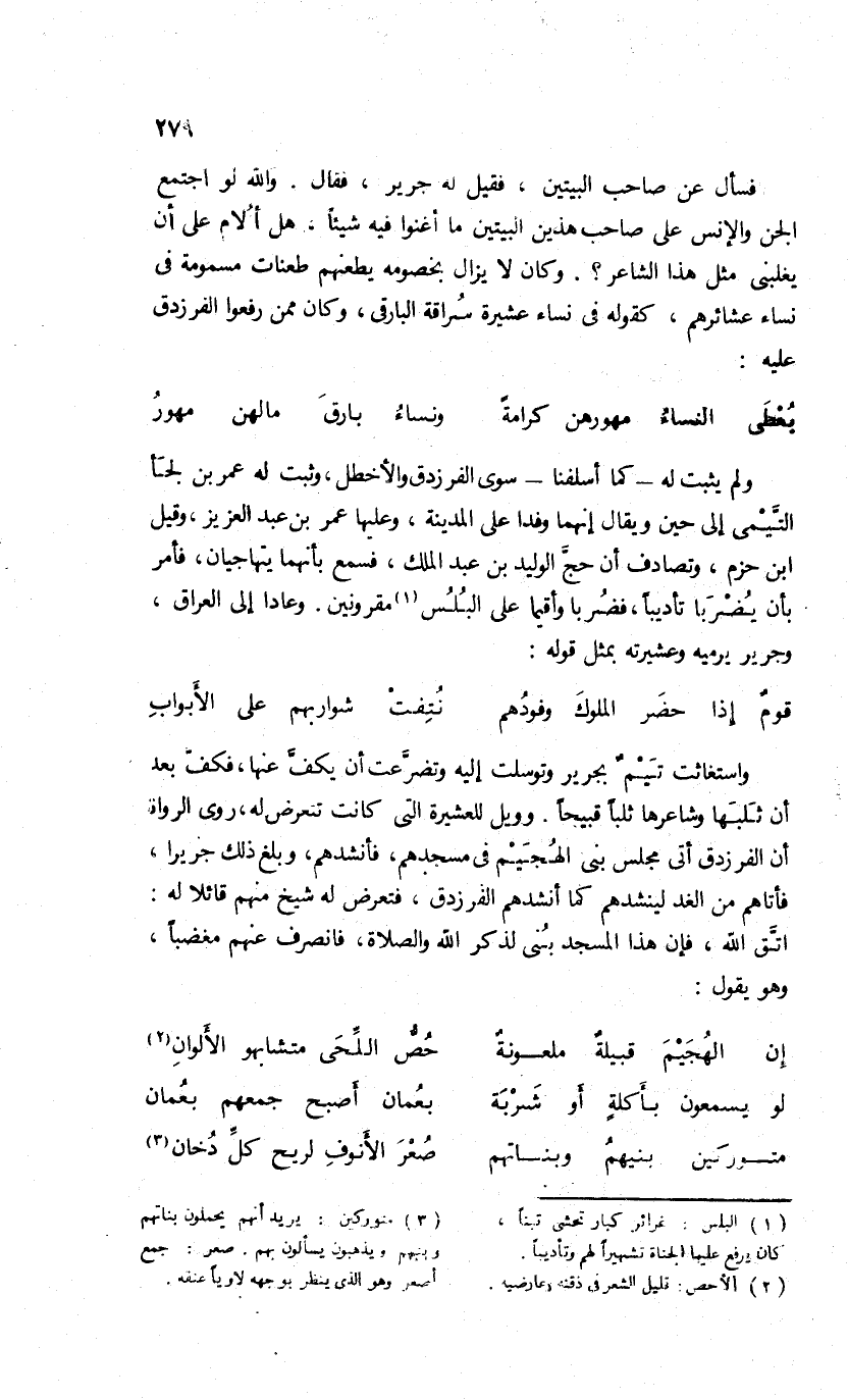 فسأل عن صاحب البيتين، فقيل له جرير، فقال: والله لو اجتمع الجن والإنس على صاحب هذين البيتين ما أغنوا فيه شيئا، هل ألام على أن يغلبنى مثل هذا الشاعر؟ . وكان لا يزال بخصومه يطعنهم طعنات مسمومة فى نساء عشائرهم، كقوله فى نساء عشيرة سراقة البارقى، وكان ممن رفعوا الفرزدق عليه: