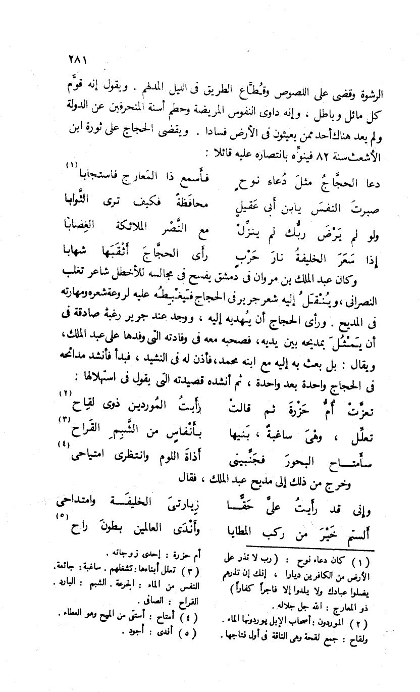 دعا الحجّاج مثل دعاء نوح … فأسمع ذا المعارج فاستجابا (¬1)