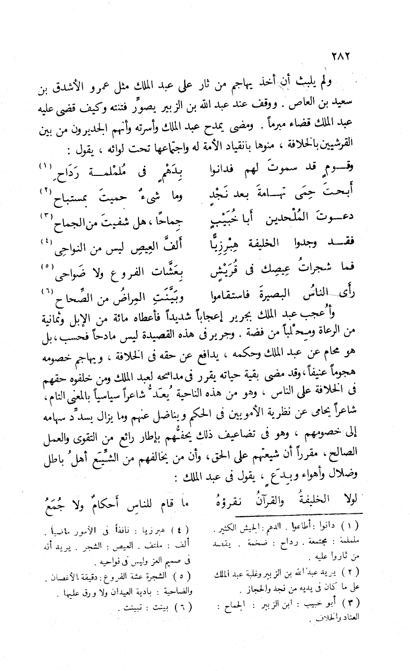 وأعجب عبد الملك بجرير إعجابا شديدا فأعطاه مائة من الإبل وثمانية من الرعاة ومحلبا من فضة. وجرير فى هذه القصيدة ليس مادحا فحسب، بل هو محام عن عبد الملك وحكمه، يدافع عن حقه فى الخلافة، ويهاجم خصومه هجوما عنيفا، وقد مضى بقية حياته يقرر فى مدائحه لعبد الملك ومن خلفوه حقهم فى الخلافة على الناس، وهو من هذه الناحية يعدّ شاعرا سياسيا بالمعنى التام، شاعرا يحامى عن نظرية الأمويين فى الحكم ويناضل عنهم وما يزال يسدّد سهامه إلى خصومهم، وهو فى تضاعيف ذلك يحفّهم بإطار رائع من التقوى والعمل الصالح، مقررا أن شيعتهم على الحق، وأن من يخالفهم من الشّيع أهل باطل وضلال وأهواء وبدع، يقول فى عبد الملك: