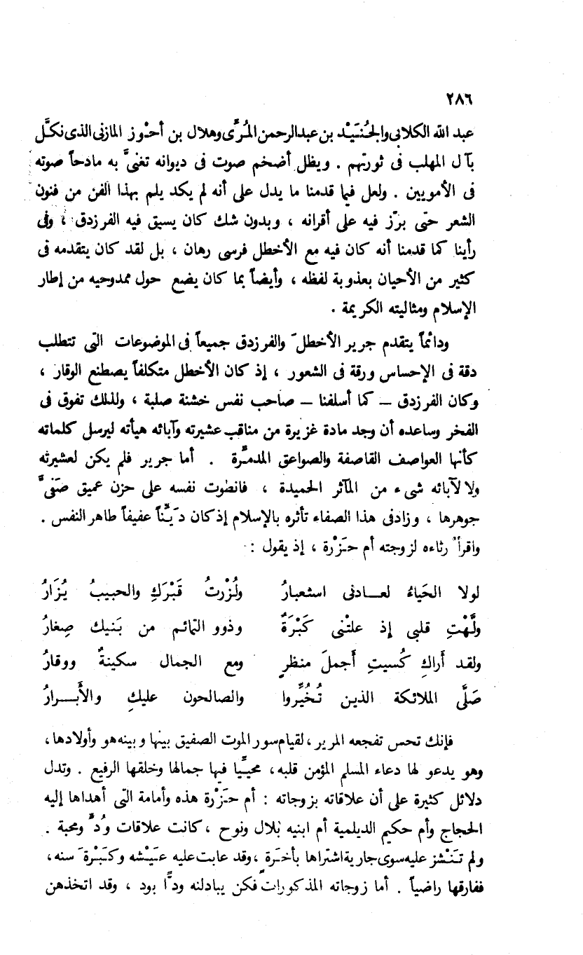 فإنك تحس تفجعه المرير، لقيام سور الموت الصفيق بينها وبينه هو وأولادها، وهو يدعو لها دعاء المسلم المؤمن قلبه، محيّيا فيها جمالها وخلقها الرفيع. وتدل دلائل كثيرة على أن علاقاته بزوجاته: أم حزرة هذه وأمامة التى أهداها إليه الحجاج وأم حكيم الديلمية أم ابنيه بلال ونوح، كانت علاقات ودّ ومحبة.