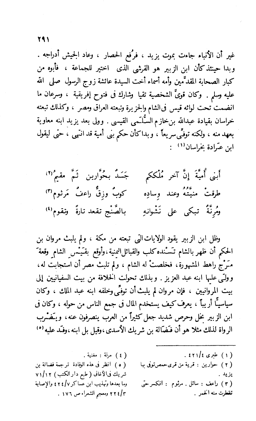 وظل ابن الزبير يقود الولايات التى تبعته من مكة، ولم يلبث مروان بن الحكم أن ظهر بالشام تسنده كلب والقبائل اليمنية، وأوقع بقيس الشام وقعة مرج راهط المشهورة، فخلصت له الشام، ولم تلبث مصر أن استجابت له، وولّى عليها ابنه عبد العزيز. وبذلك تحولت الخلافة من بيت السفيانيين إلى بيت المروانيين، فإن مروان لم يلبث أن توفّى وخلفه ابنه عبد الملك، وكان سياسيّا أريبا، يعرف كيف يستخدم المال فى جمع الناس من حوله، وكان فى ابن الزبير بخل وحرص شديد جعل كثيرا من العرب ينصرفون عنه، ويضرب الرواة لذلك مثلا هو أن فضالة بن شريك الأسدى، وقيل بل ابنه، وفد عليه (¬5)