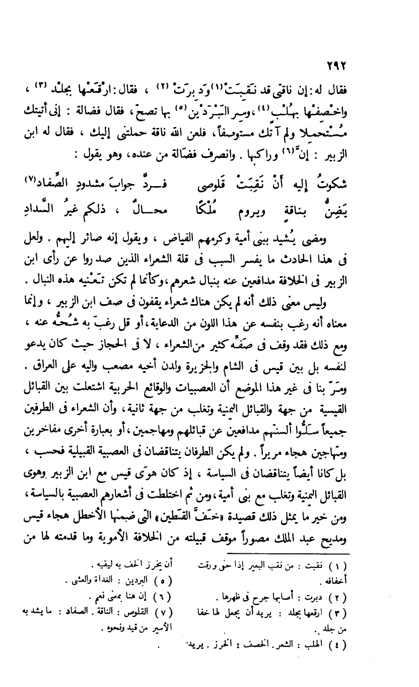 فقال له: إن ناقتى قد نقبت (¬1) ودبرت (¬2)، فقال: ارقعها بجلد (¬3)، واخصفها بهلب (¬4)، وسر البردين (¬5) بها تصحّ، فقال فضالة: إنى أتيتك مستحملا ولم آتك مستوصفا، فلعن الله ناقة حملتنى إليك، فقال له ابن الزبير: إنّ (¬6) وراكبها. وانصرف فضالة من عنده، وهو يقول: