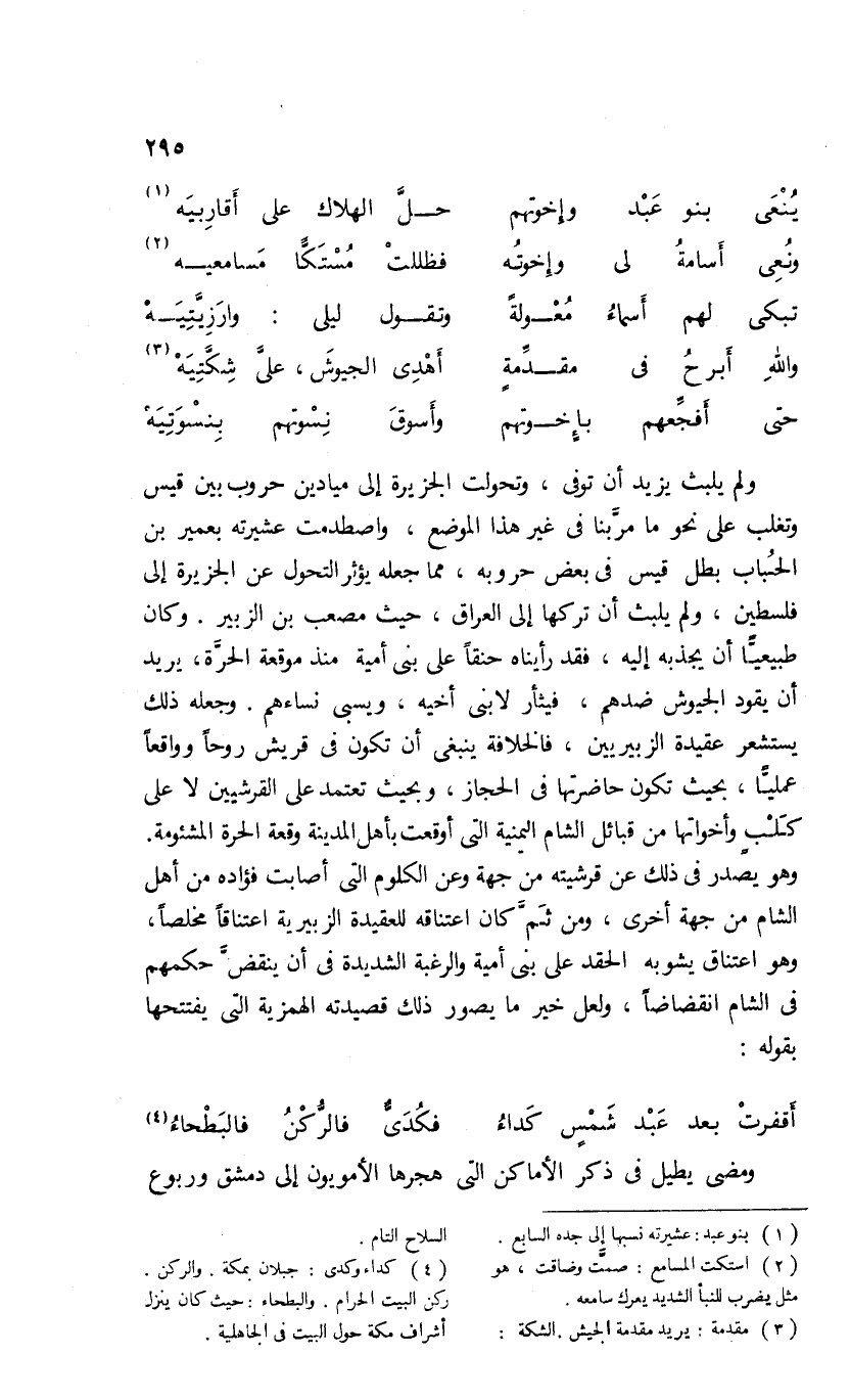 وهو يصدر فى ذلك عن قرشيته من جهة وعن الكلوم التى أصابت فؤاده من أهل الشام من جهة أخرى، ومن ثمّ كان اعتناقه للعقيدة الزبيرية اعتناقا مخلصا، وهو اعتناق يشوبه الحقد على بنى أمية والرغبة الشديدة فى أن ينقضّ حكمهم فى الشام انقضاضا، ولعل خير ما يصور ذلك قصيدته الهمزية التى يفتتحها بقوله:
