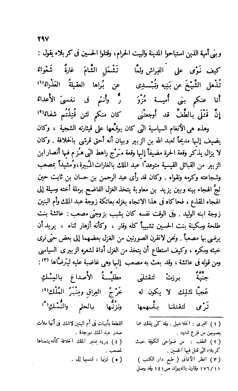 وهذه هى الأنغام السياسية التى كان يوقّعها على قيثارته الشجية، وكان يضيف إليها مديحا لعبد الله بن الزبير وبيان أنه أحق قرشى بالخلافة. وكان لا يزال يذكر وقعة الحرة مضيفا إليها وقعة مرج راهط التى هزم فيها أنصار ابن الزبير من القبائل القيسية متوعدا عبد الملك بالغارات المبيرة، ومشيدا بمصعب وشجاعته وكرمه وتقواه. وكان قد رأى عبد الرحمن بن حسان بن ثابت حين لجّ الهجاء بينه وبين يزيد بن معاوية يتخذ الغزل الفاضح برملة أخته وسيلة إلى الهجاء المقذع، فحاكاه فى هذا الاتجاه بغزله بعاتكة زوجة عبد الملك وأم البنين زوجة ابنه الوليد. وفى الوقت نفسه كان يشبب بزوجتى مصعب: عائشة بنت طلحة وسكينة بنت الحسين تشبيبا كله وقار، وكأنه أزهار ثناء، يريد أن يرضى بها مصعبا. ونحن لا نقرن الصورتين من الغزل بعضهما إلى بعض حتى نرى خبثه ومكره، وكيف استطاع أن يتخذ من الغزل أداة لشعره الزبيرى السياسى ومن قوله فى عائشة، وقد بعث به مصعب إليها وهى غاضبة عليه ليترضّاها (¬3):