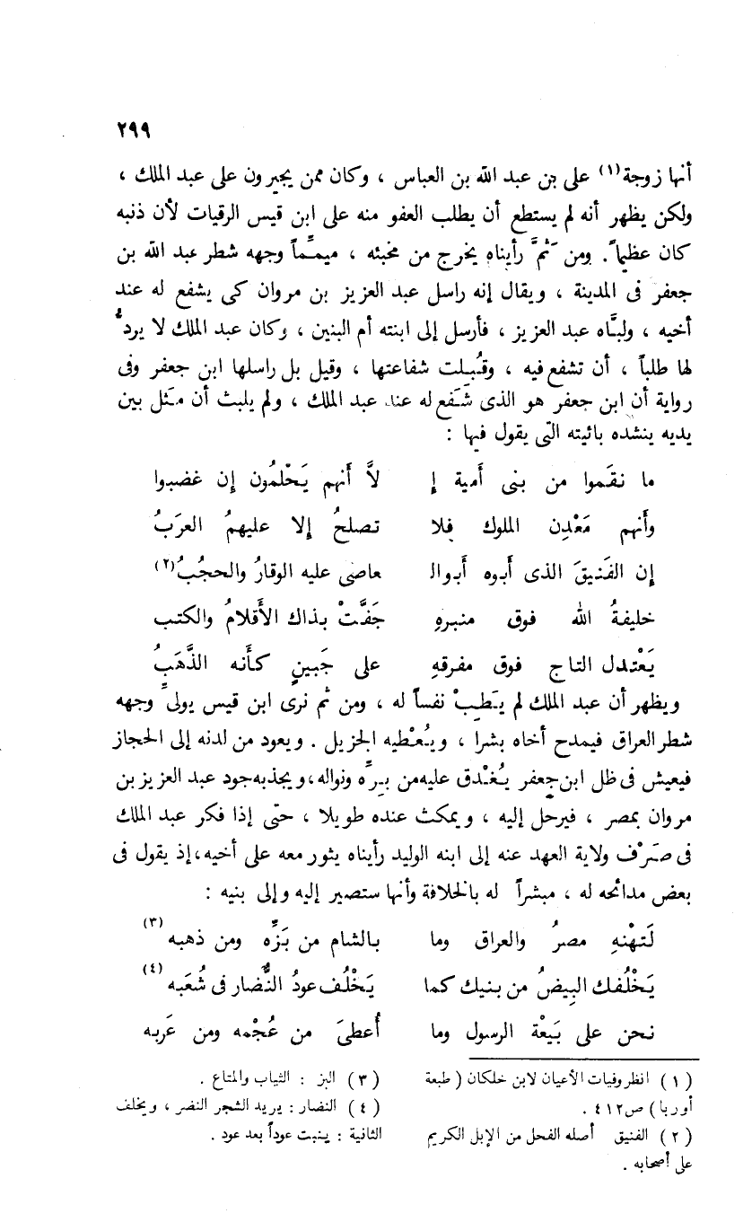 أنها زوجة (¬1) على بن عبد الله بن العباس، وكان ممن يجيرون على عبد الملك، ولكن يظهر أنه لم يستطع أن يطلب العفو منه على ابن قيس الرقيات لأن ذنبه كان عظيما. ومن ثمّ رأيناه يخرج من مخبئه، ميمّما وجهه شطر عبد الله بن جعفر فى المدينة، ويقال إنه راسل عبد العزيز بن مروان كى يشفع له عند أخيه، ولبّاه عبد العزيز، فأرسل إلى ابنته أم البنين، وكان عبد الملك لا يردّ لها طلبا، أن تشفع فيه، وقبلت شفاعتها، وقيل بل راسلها ابن جعفر وفى رواية أن ابن جعفر هو الذى شفع له عند عبد الملك، ولم يلبث أن مثل بين يديه ينشده بائيته التى يقول فيها: