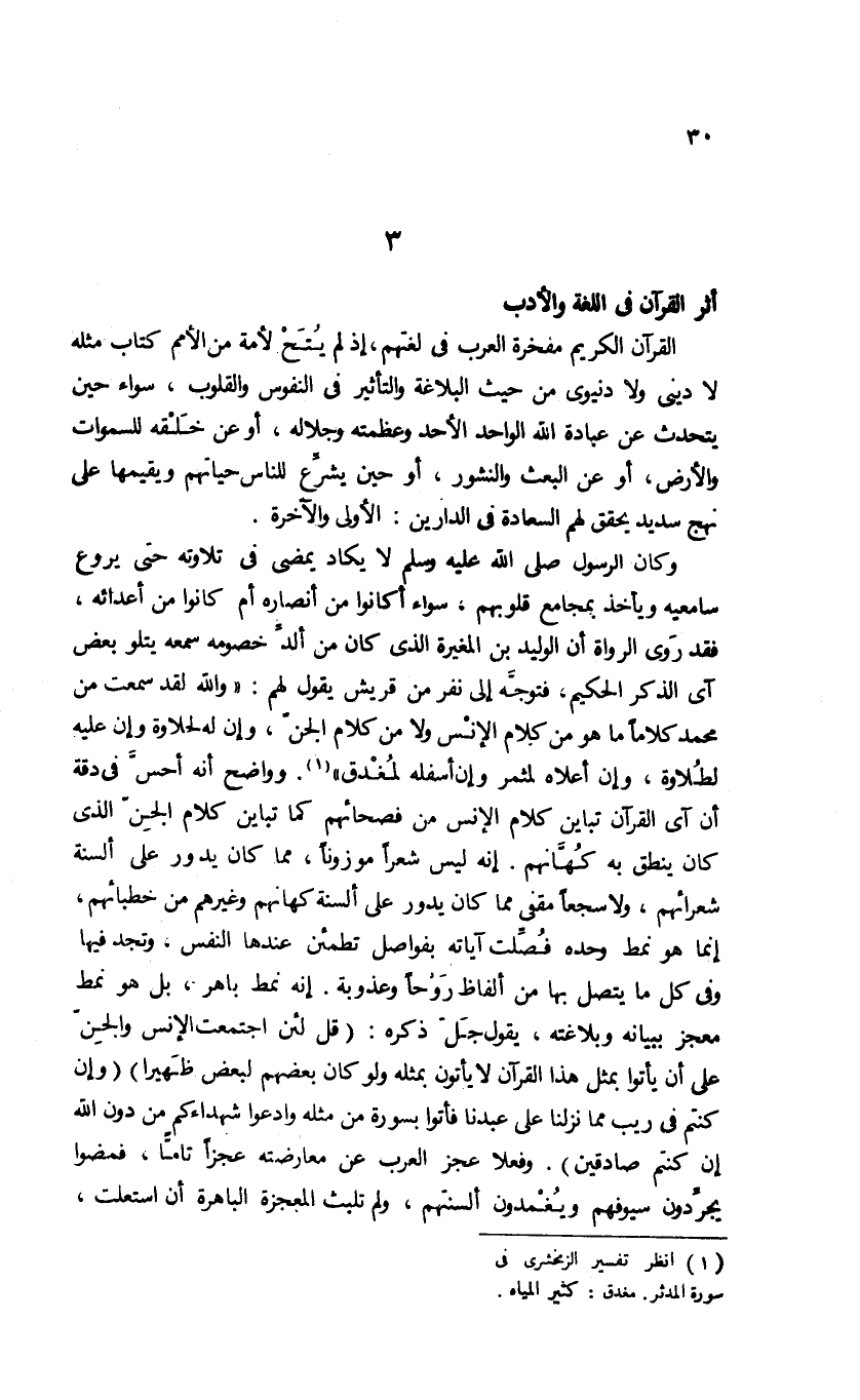 وكان الرسول صلى الله عليه وسلم لا يكاد يمضى فى تلاوته حتى يروع سامعيه ويأخذ بمجامع قلوبهم، سواء أكانوا من أنصاره أم كانوا من أعدائه، فقد روى الرواة أن الوليد بن المغيرة الذى كان من ألدّ خصومه سمعه يتلو بعض آى الذكر الحكيم، فتوجّه إلى نفر من قريش يقول لهم: «والله لقد سمعت من محمد كلاما ما هو من كلام الإنس ولا من كلام الجنّ، وإن له لحلاوة وإن عليه لطلاوة، وإن أعلاه لمثمر وإن أسفله لمغدق» (¬1). وواضح أنه أحسّ فى دقة أن آى القرآن تباين كلام الإنس من فصحائهم كما تباين كلام الجنّ الذى كان ينطق به كهّانهم. إنه ليس شعرا موزونا، مما كان يدور على ألسنة شعرائهم، ولا سجعا مقفى مما كان يدور على ألسنة كهانهم وغيرهم من خطبائهم، إنما هو نمط وحده فصّلت آياته بفواصل تطمئن عندها النفس، وتجد فيها وفى كل ما يتصل بها من ألفاظ روحا وعذوبة. إنه نمط باهر، بل هو نمط معجز ببيانه وبلاغته، يقول جلّ ذكره: {(قُلْ لَئِنِ اِجْتَمَعَتِ الْإِنْسُ وَالْجِنُّ عَلى أَنْ يَأْتُوا بِمِثْلِ هذَا الْقُرْآنِ لا يَأْتُونَ بِمِثْلِهِ وَلَوْ كانَ بَعْضُهُمْ لِبَعْضٍ ظَهِيراً)} {(وَإِنْ كُنْتُمْ فِي رَيْبٍ مِمّا نَزَّلْنا عَلى عَبْدِنا فَأْتُوا بِسُورَةٍ مِنْ مِثْلِهِ وَاُدْعُوا شُهَداءَكُمْ مِنْ دُونِ اللهِ إِنْ كُنْتُمْ صادِقِينَ).} وفعلا عجز العرب عن معارضته عجزا تامّا، فمضوا يجرّدون سيوفهم ويغمدون ألسنتهم، ولم نلبث المعجزة الباهرة أن استعلت،