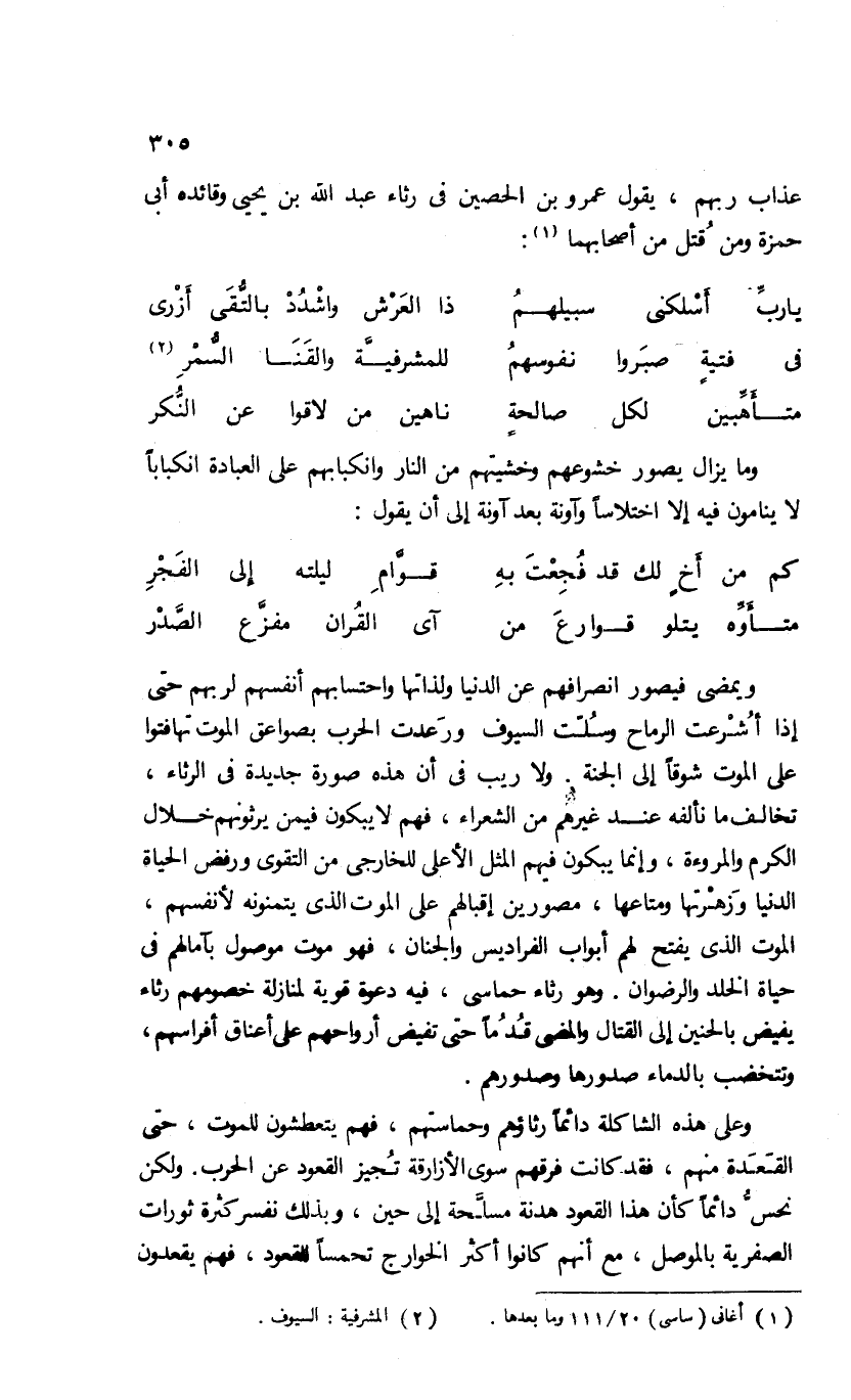 ويمضى فيصور انصرافهم عن الدنيا ولذاتها واحتسابهم أنفسهم لربهم حتى إذا أشرعت الرماح وسلّت السيوف ورعدت الحرب بصواعق الموت تهافتوا على الموت شوقا إلى الجنة. ولا ريب فى أن هذه صورة جديدة فى الرثاء، تخالف ما نألفه عند غيرهم من الشعراء، فهم لا يبكون فيمن يرثونهم خلال الكرم والمروءة، وإنما يبكون فيهم المثل الأعلى للخارجى من التقوى ورفض الحياة الدنيا وزهرتها ومتاعها، مصورين إقبالهم على الموت الذى يتمنونه لأنفسهم، الموت الذى يفتح لهم أبواب الفراديس والجنان، فهو موت موصول بآمالهم فى حياة الخلد والرضوان. وهو رثاء حماسى، فيه دعوة قوية لمنازلة خصومهم رثاء يفيض بالحنين إلى القتال والمضى قدما حتى تفيض أرواحهم على أعناق أفراسهم، وتتخضب بالدماء صدورها وصدورهم.