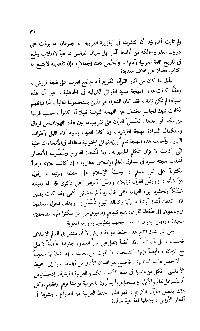 ومن غير شك أتاح هذا الحفظ للهجة قريش لا أن تنتشر فى العالم الإسلامى فحسب، بل أن تحفظ أيضا وتظل على مرّ العصور جديدة عضّة لا تبلى مع الزمان، وأيضا فإنها اكتسحت ما لقيت من لغات، إذ اتخذتها شعوب -لا حصر لها-لسانها، فأصبح هو اللسان الأدبى من أواسط آسيا إلى المحيط الأطلسى. فكل من عاشوا فى هذه الأنحاء تكلموا العربية القرشية، إذ حلّت من ألسنتهم محل لغاتهم الأولى وأصبحوا عربا يعبّرون بالعربية عن مشاعرهم وعقولهم، وكل ذلك بفضل القرآن الكريم، فهو الذى حفظ العربية من الضياع، ونشرها فى أقطار الأرض، وجعلها لغة حية خالدة.