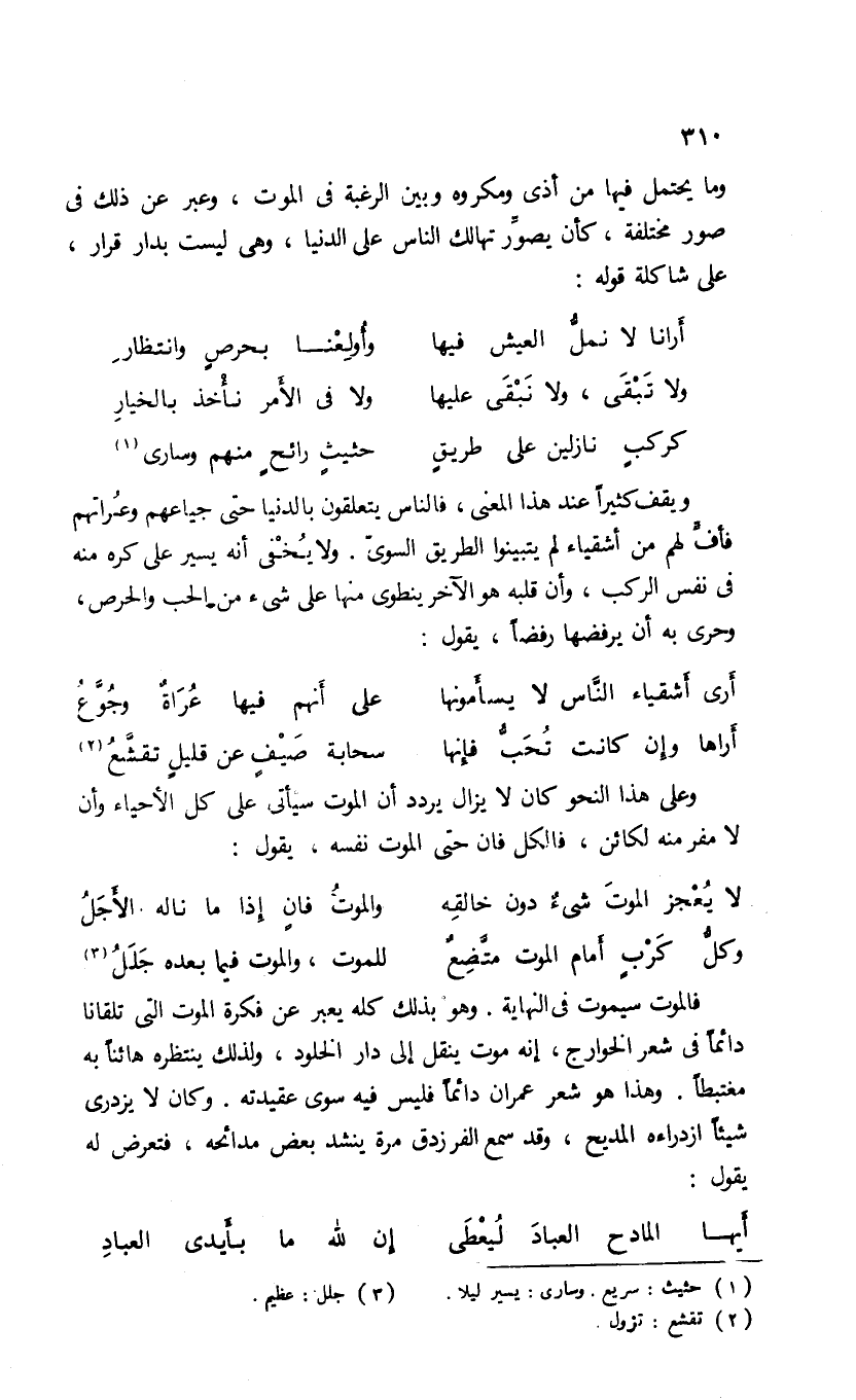 فالموت سيموت فى النهاية. وهو بذلك كله يعبر عن فكرة الموت التى تلقانا دائما فى شعر الخوارج، إنه موت ينقل إلى دار الخلود، ولذلك ينتظره هائنا به مغتبطا. وهذا هو شعر عمران دائما فليس فيه سوى عقيدته. وكان لا يزدرى شيئا ازدراءه المديح، وقد سمع الفرزدق مرة ينشد بعض مدائحه، فتعرض له يقول: