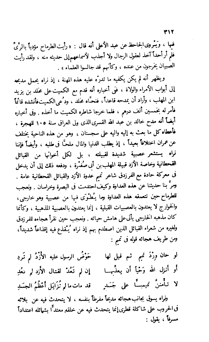 ومرّ بنا حديثنا عن هذه العداوة وكيف احتدمت فى البصرة وخراسان. ونعجب للطرماح حين تتعمقه هذه العداوة وما يطوى فيها من عصبية وهو خارجى، والخوارج لا يعتدون بالعصبيات القبلية، إنما يعتدون بالعصبية المذهبية، وكأنما كان مذهبه الخارجى يأتى على هامش حياته. ونعجب حين نقرأ هجاءه للفرزدق ولغيره من شعراء القبائل الذين اصطدم بهم إذ نراه يقذع فيه إقذاعا شديدا، ومن طريف هجائه قوله فى تميم: