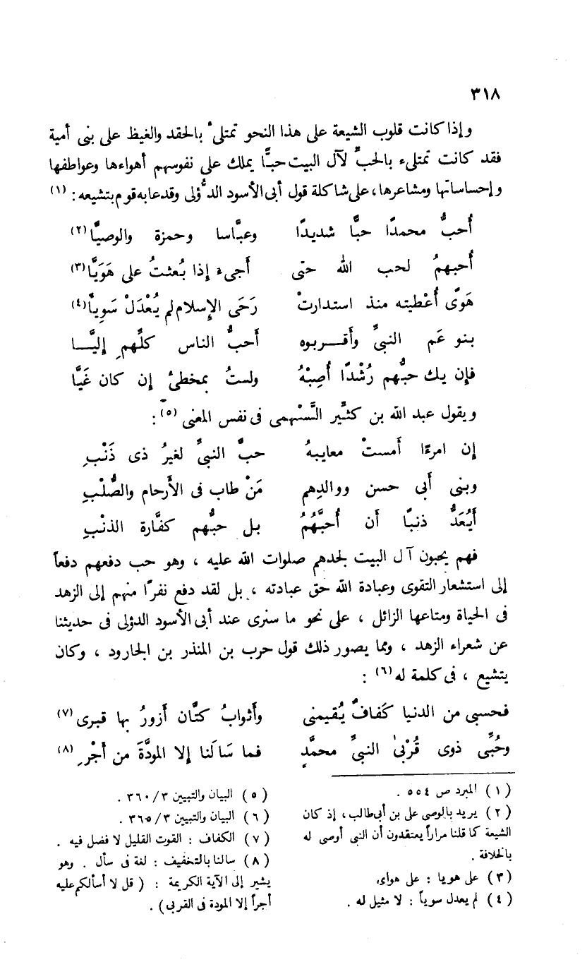 وإذا كانت قلوب الشيعة على هذا النحو تمتلئ بالحقد والغيظ على بنى أمية فقد كانت تمتلئ بالحبّ لآل البيت حبّا يملك على نفوسهم أهواءها وعواطفها وإحساساتها ومشاعرها، على شاكلة قول أبى الأسود الدّؤلى وقد عابه قوم بتشيعه: (¬1)