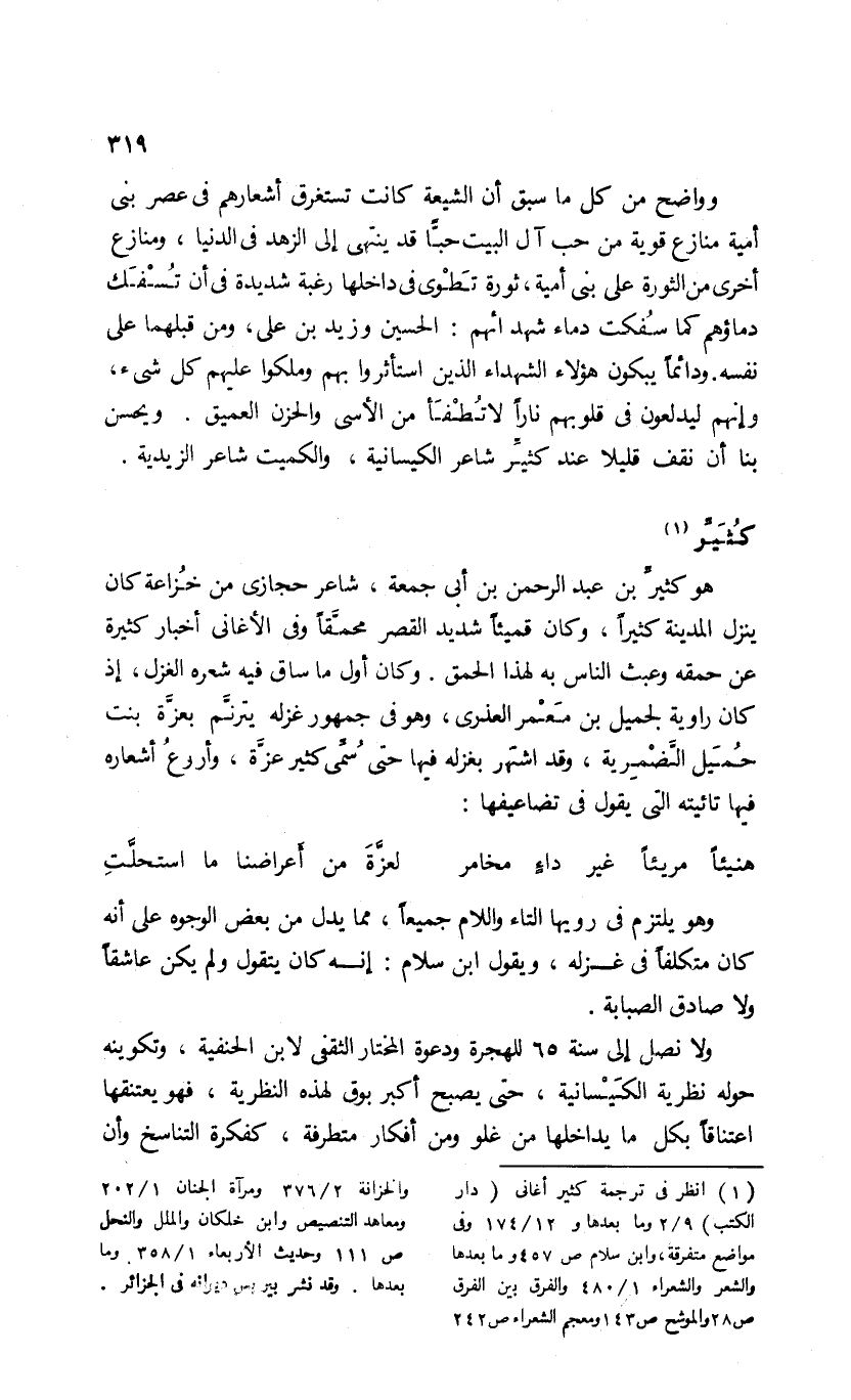 (¬1) انظر فى ترجمة كثير أغانى (دار الكتب) 9/ 2 وما بعدها و 12/ 174 وفى مواضع متفرقة، وابن سلام ص 457 وما بعدها والشعر والشعراء 1/ 480 والفرق بين الفرق ص 28 والموشح ص 143 ومعجم الشعراء ص 242 والخزانة 2/ 376 ومرآة الجنان 1/ 202 ومعاهد التنصيص وابن خلكان والملل والنحل ص 111 وحديث الأربعاء 1/ 358 وما بعدها. وقد نشر بيريس ديوانه فى الجزائر.