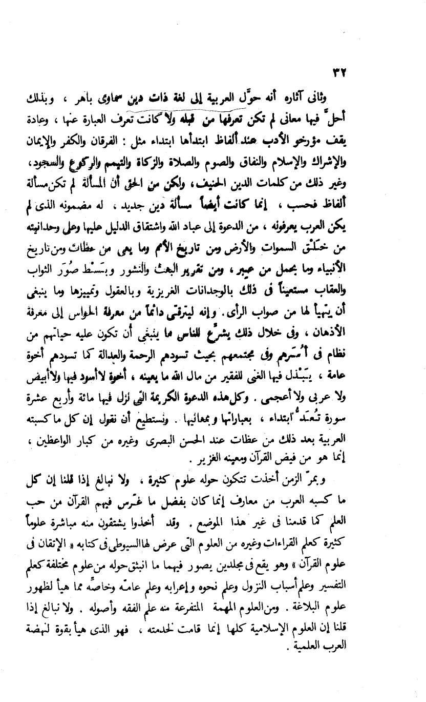 وثانى آثاره أنه حوّل العربية إلى لغة ذات دين سماوى باهر، وبذلك أحلّ فيها معانى لم تكن تعرفها من قبله ولا كانت تعرف العبارة عنها، وعادة يقف مؤرخو الأدب عند ألفاظ ابتدأها ابتداء مثل: الفرقان والكفر والإيمان والإشراك والإسلام والنفاق والصوم والصلاة والزكاة والتيمم والركوع والسجود، وغير ذلك من كلمات الدين الحنيف، ولكن من الحق أن المسألة لم تكن مسألة ألفاظ فحسب، إنما كانت أيضا مسألة دين جديد، له مضمونه الذى لم يكن العرب يعرفونه، من الدعوة إلى عباد الله واشتقاق الدليل عليها وعلى وحدانيته.