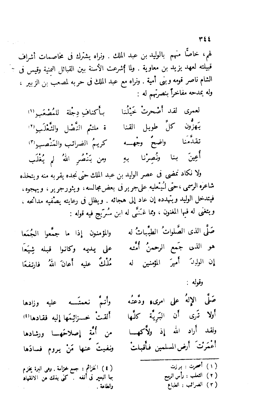 لهم، خاصّا منهم بالوليد بن عبد الملك. ونراه يشترك فى مخاصمات أشراف قبيلته لعهد يزيد بن معاوية. ولما أشرعت الأسنة بين القبائل اليمنية وقيس فى الشام ناصر قومه وبنى أمية. ونراه مع عبد الملك فى حربه لمصعب بن الزبير، وله يمدحه مفاخرا بنصرتهم له: