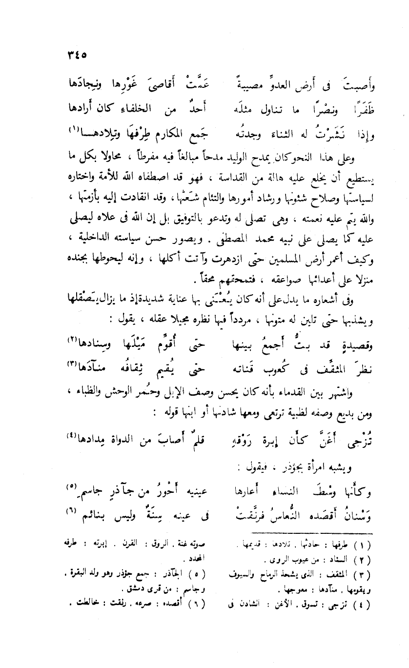 وعلى هذا النحو كان يمدح الوليد مدحا مبالغا فيه مفرطا، محاولا بكل ما يستطيع أن يخلع عليه هالة من القداسة، فهو قد اصطفاه الله للأمة واختاره لسياستها وصلاح شئونها ورشاد أمورها والتئام شعثها، وقد انقادت إليه بأزمتها، والله يتم عليه نعمته، وهى تصلى له وتدعو بالتوفيق بل إن الله فى علاه ليصلى عليه كما يصلى على نبيه محمد المصطفى. ويصور حسن سياسته الداخلية، وكيف أعمر أرض المسلمين حتى ازدهرت وآتت أكلها، وإنه ليحوطها بجنده منزلا على أعدائها صواعقه، فتمحقهم محقا.