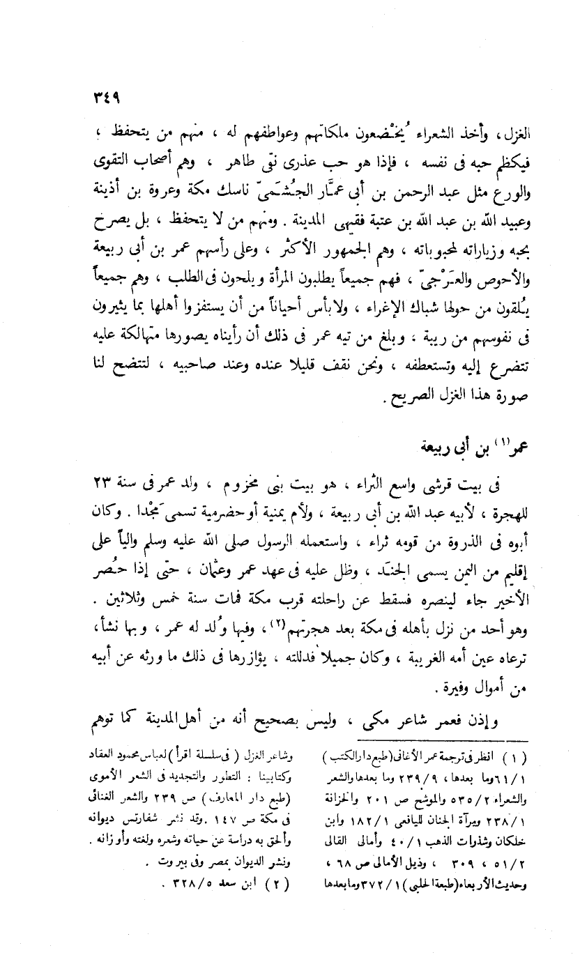 (¬1) انظر فى ترجمة عمر الأغانى (طبع دار الكتب) 1/ 61 وما بعدها، 9/ 239 وما بعدها والشعر والشعراء 2/ 535 والموشح ص 201 والخزانة 1/ 238 ومرآة الجنان لليافعى 1/ 182 وابن خلكان وشذرات الذهب 1/ 40 وأمالى القالى 2/ 51، 309، وذيل الأمالى ص 68، وحديث الأربعاء (طبعة الحلبى) 1/ 372 وما بعدها وشاعر الغزل (فى سلسلة اقرأ) لعباس محمود العقاد وكتاببنا: التطور والتجديد فى الشعر الأموى (طبع دار المعارف) ص 239 والشعر والغناء فى المدينة ومكة ص 239. وقد نشر تس؟ ؟ ؟ ديوانه والحق به دراسة عن حياته وشعره ولغته؟ ؟ ؟ . ونشر الديوان بمصر وفى بيروت
