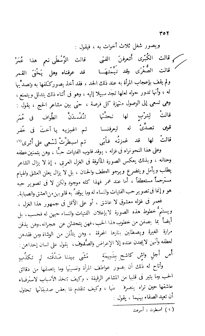وعلى هذا النحو نراه فى غزله، يوقد قلوب الفتيات حبّا، وهن يتمنين عطفه وحنانه، وبذلك يعكس الصورة المألوفة فى الغزل العربى، إذ لا يزال الشاعر يطلب ويأمل ويتضرع ويرجو العطف والحنان، بل لا يزال يعلن العشق والهيام مسترحما مستعطفا، أما عند عمر فهذا كله موجود ولكن لا فى تصوير حبه هو وإنما فى تصوير حب الفتيات والنساء له وما يوقد به قلوبهن من العشق والصبابة.