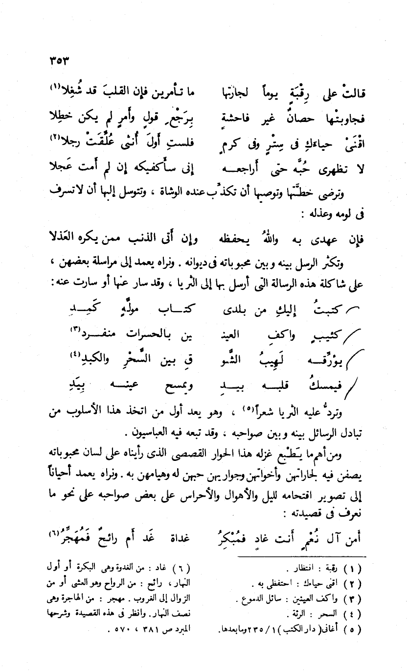 وتردّ عليه الثريا شعرا (¬5)، وهو يعد أول من اتخذ هذا الأسلوب من تبادل الرسائل بينه وبين صواحبه، وقد تبعه فيه العباسيون.