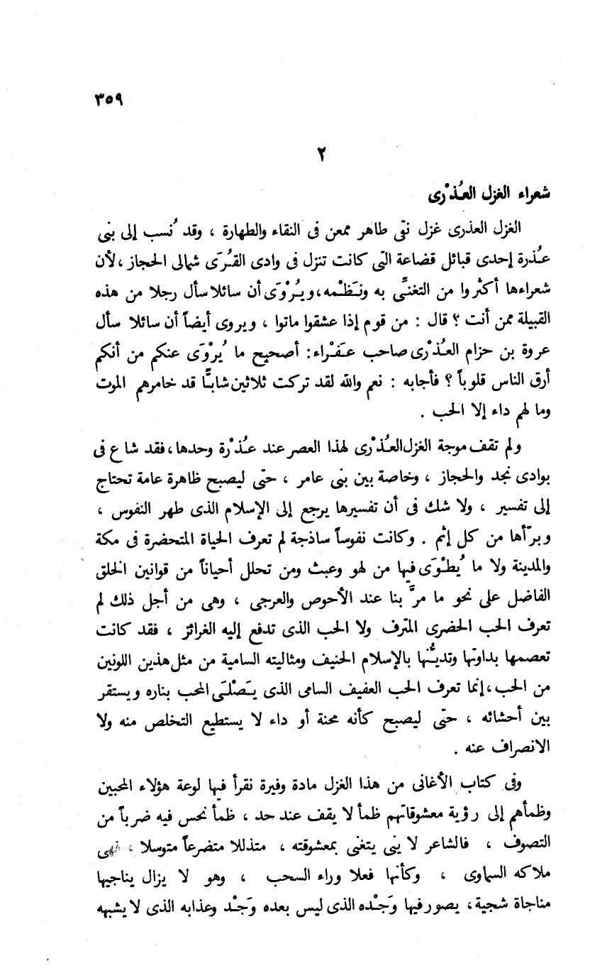 ولم تقف موجة الغزل العذرى لهذا العصر عند عذرة وحدها، فقد شاع فى بوادى نجد والحجاز، وخاصة بين بنى عامر، حتى ليصبح ظاهرة عامة تحتاج إلى تفسير، ولا شك فى أن تفسيرها يرجع إلى الإسلام الذى طهر النفوس، وبرّأها من كل إثم. وكانت نفوسا ساذجة لم تعرف الحياة المتحضرة فى مكة والمدينة ولا ما يطوى فيها من لهو وعبث ومن تحلل أحيانا من قوانين الخلق الفاضل على نحو ما مرّ بنا عند الأحوص والعرجى، وهى من أجل ذلك لم تعرف الحب الحضرى المترف ولا الحب الذى تدفع إليه الغرائز، فقد كانت تعصمها بداوتها وتديّنها بالإسلام الحنيف ومثاليته السامية من مثل هذين اللونين من الحب، إنما تعرف الحب العفيف السامى الذى يصلى المحب بناره ويستقر بين أحشائه، حتى ليصبح كأنه محنة أو داء لا يستطيع التخلص منه ولا الانصراف عنه.