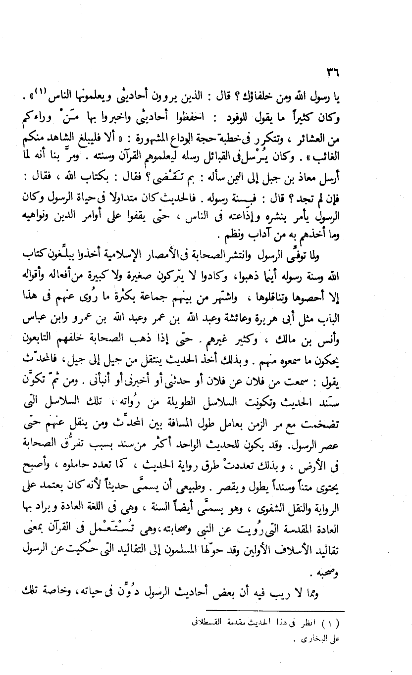 فإن لم تجد؟ قال: فبسنة رسوله. فالحديث كان متداولا فى حياة الرسول وكان الرسول يأمر بنشره وإذاعته فى الناس، حتى يقفوا على أوامر الدين ونواهيه وما أخذهم به من آداب ونظم.