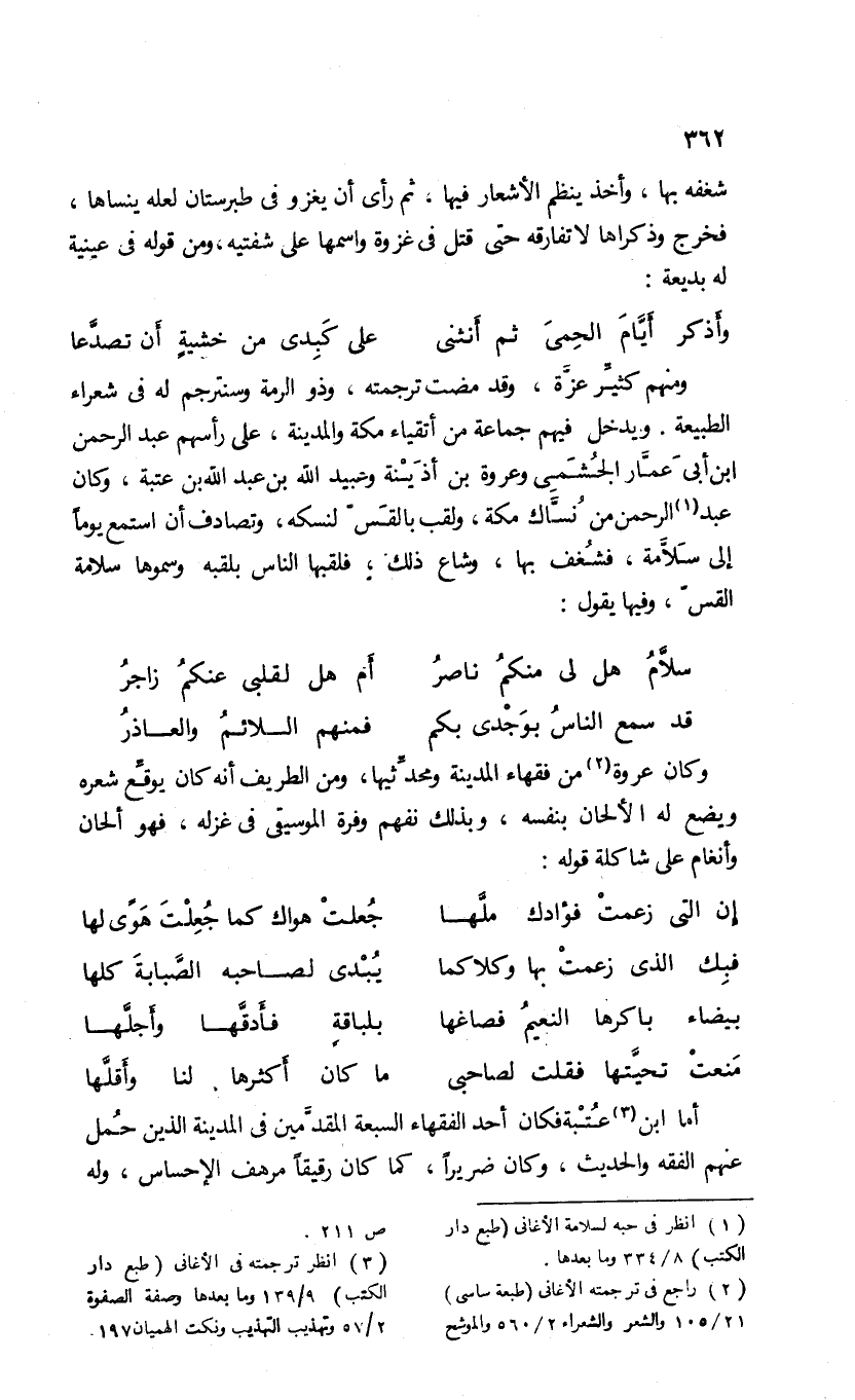 وكان عروة (¬2) من فقهاء المدينة ومحدّثيها، ومن الطريف أنه كان يوقّع شعره ويضع له الألحان بنفسه، وبذلك نفهم وفرة الموسيقى فى غزله، فهو ألحان وأنغام على شاكلة قوله: